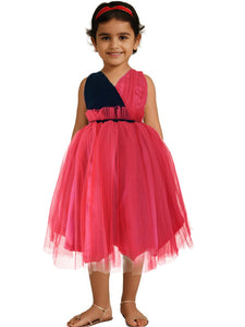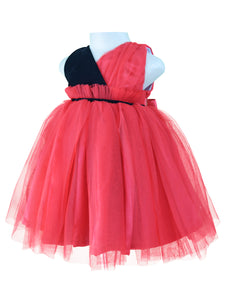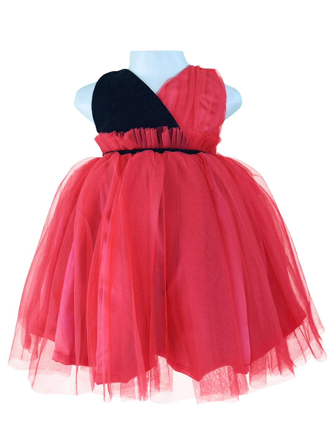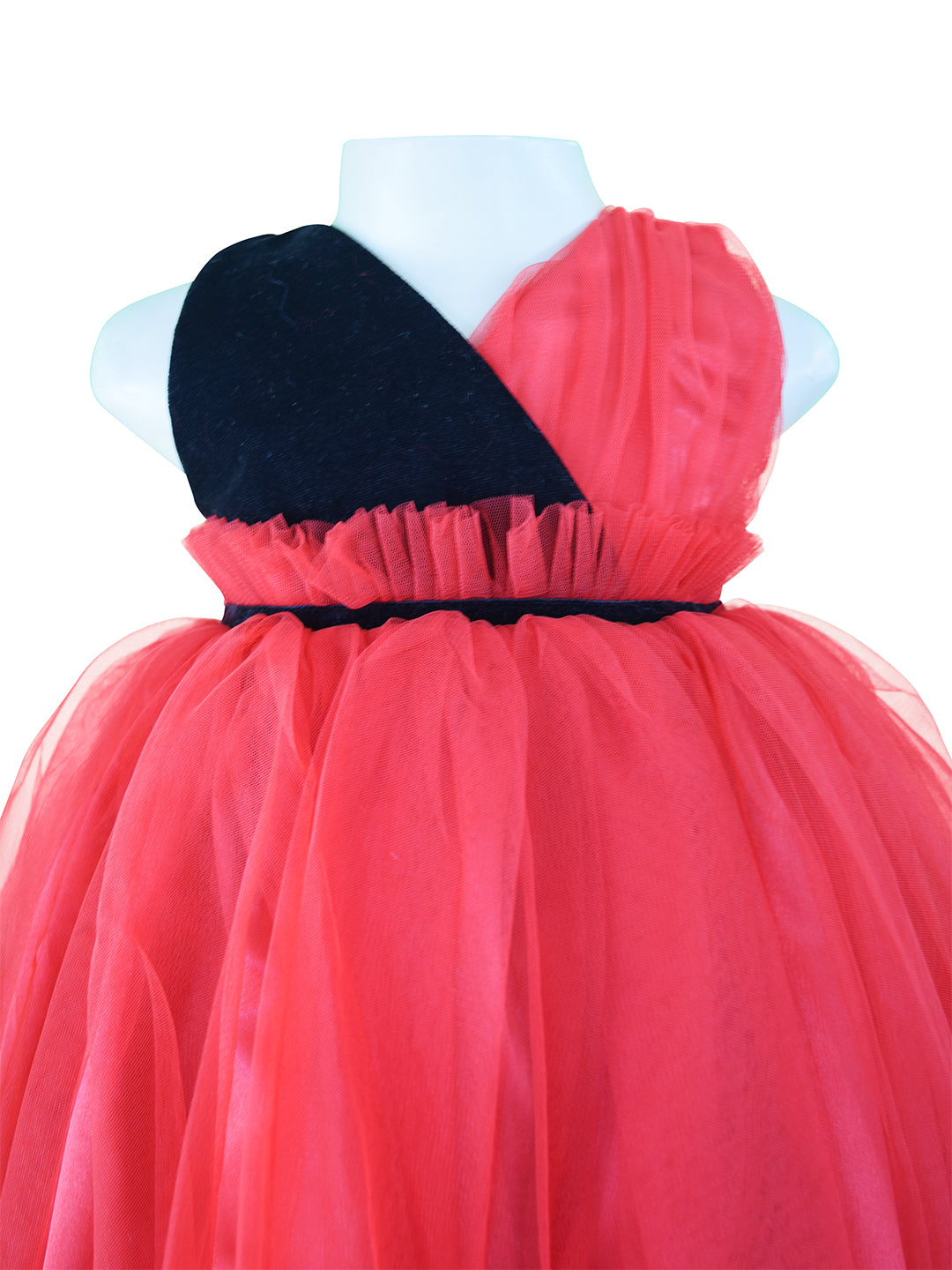 A stunning party dress for your little princess. Adorned in black velvet on one side and ruched net on the other, this surplice neckline dress strikes a perfect balance between chic & sweet. The waist sports a velvet ribbon & ruffled net on top. This beautiful black & maroon dress allows your little girl to celebrate in a sophisticated style.