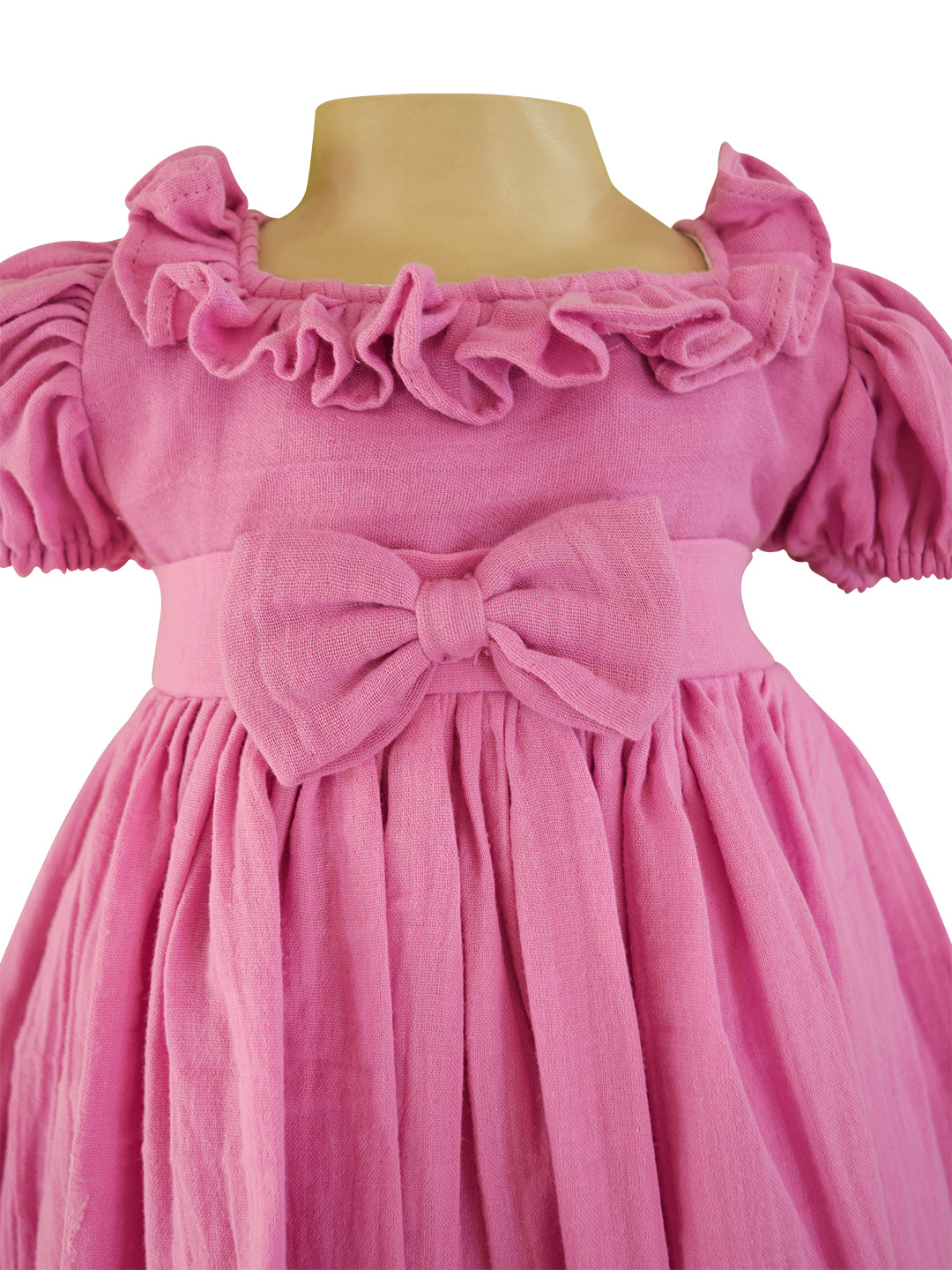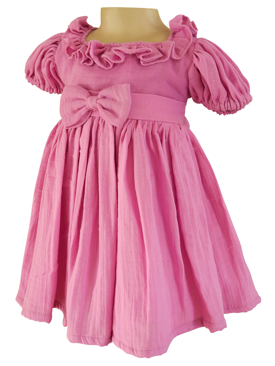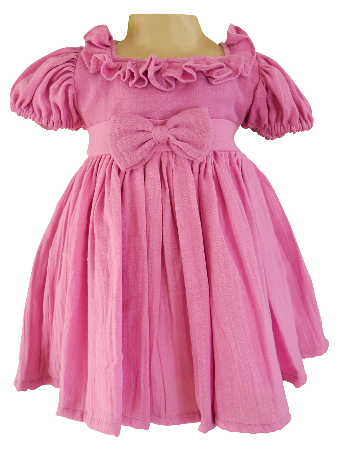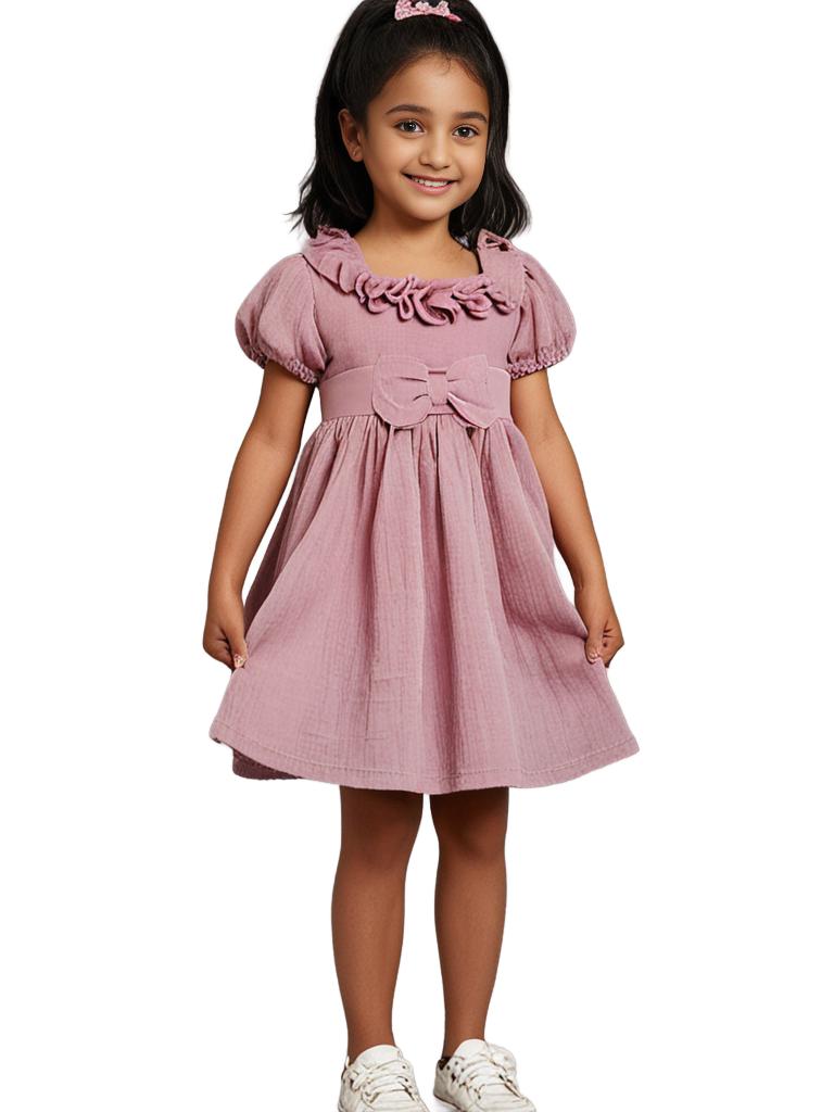 Exuding chic simplicity this Lavender girl’s dress is a perfect all season staple. Contrived from double cheese cloth, this slightly textured fabric dress features a square neck with puff sleeves. The waist is banded with a bow trim and the skirt is gathered and voluminous. Extremely comfortable and airy.