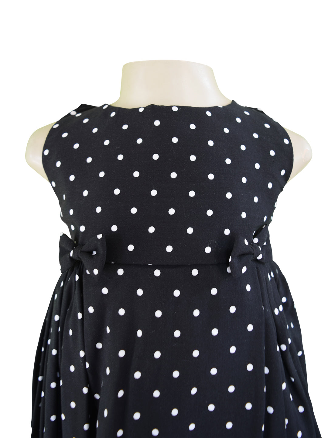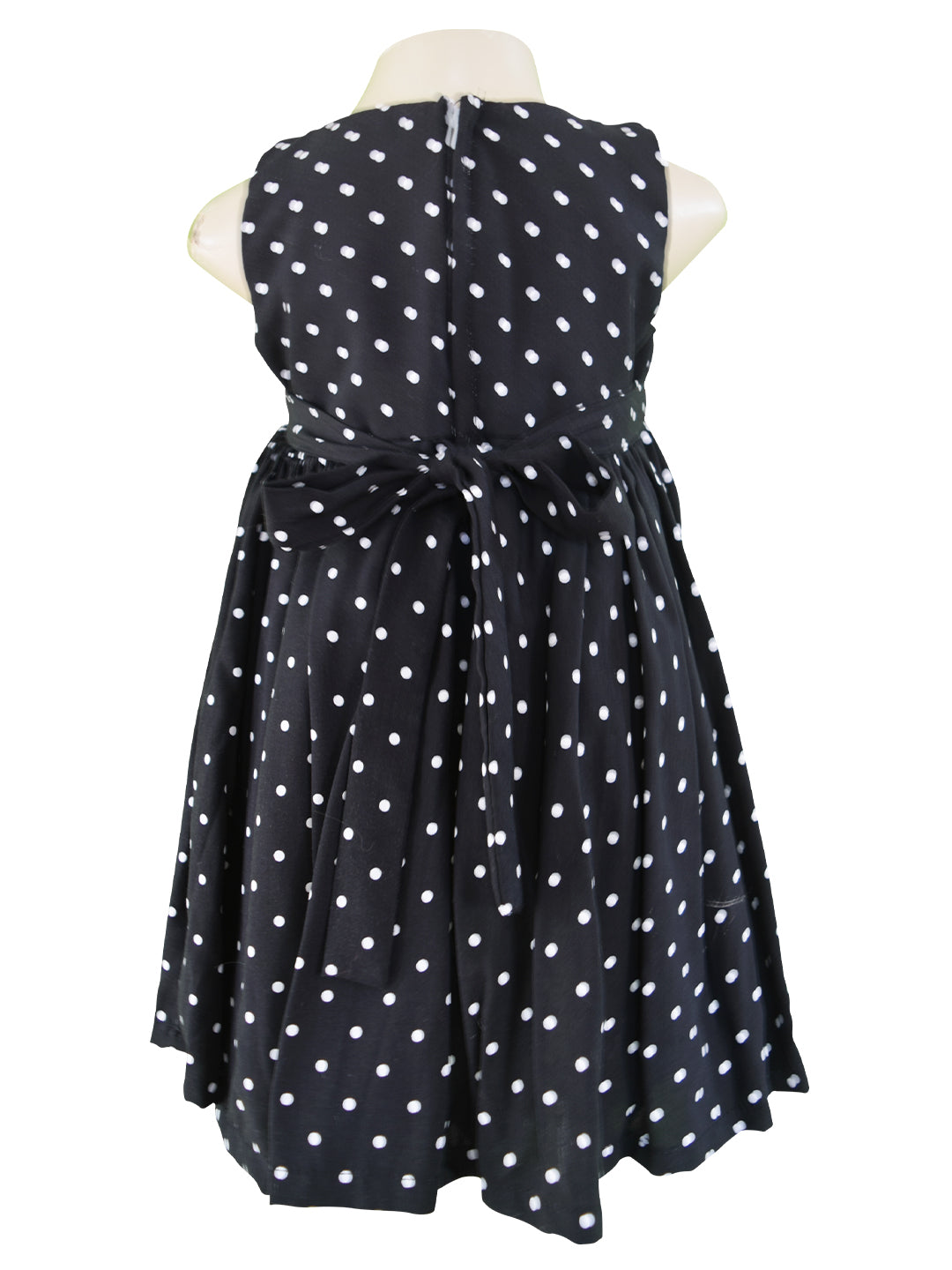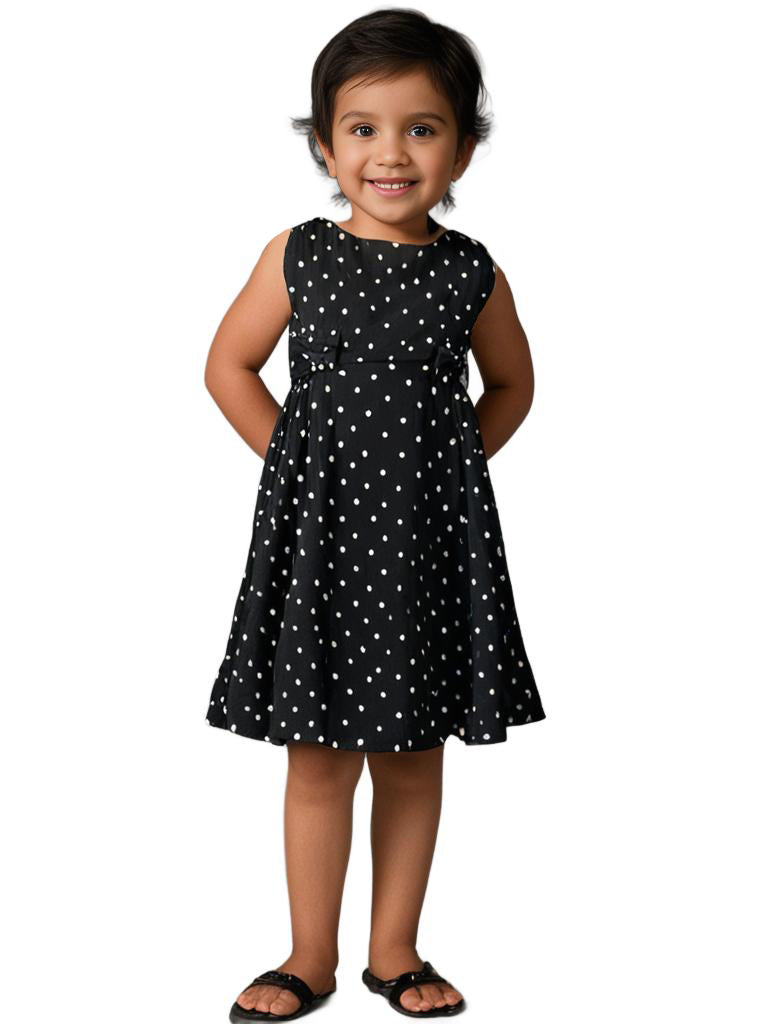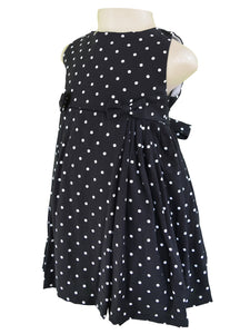 Made in Rayon, this lovely polka dot dress for little girls is sleeveless. There are gathered side panels on the skirt with matching bows for extra charm. The tie-back sash provides a good fit.