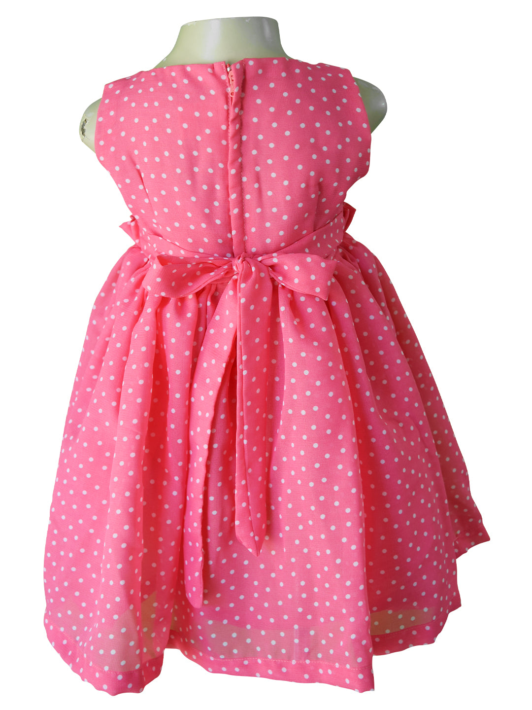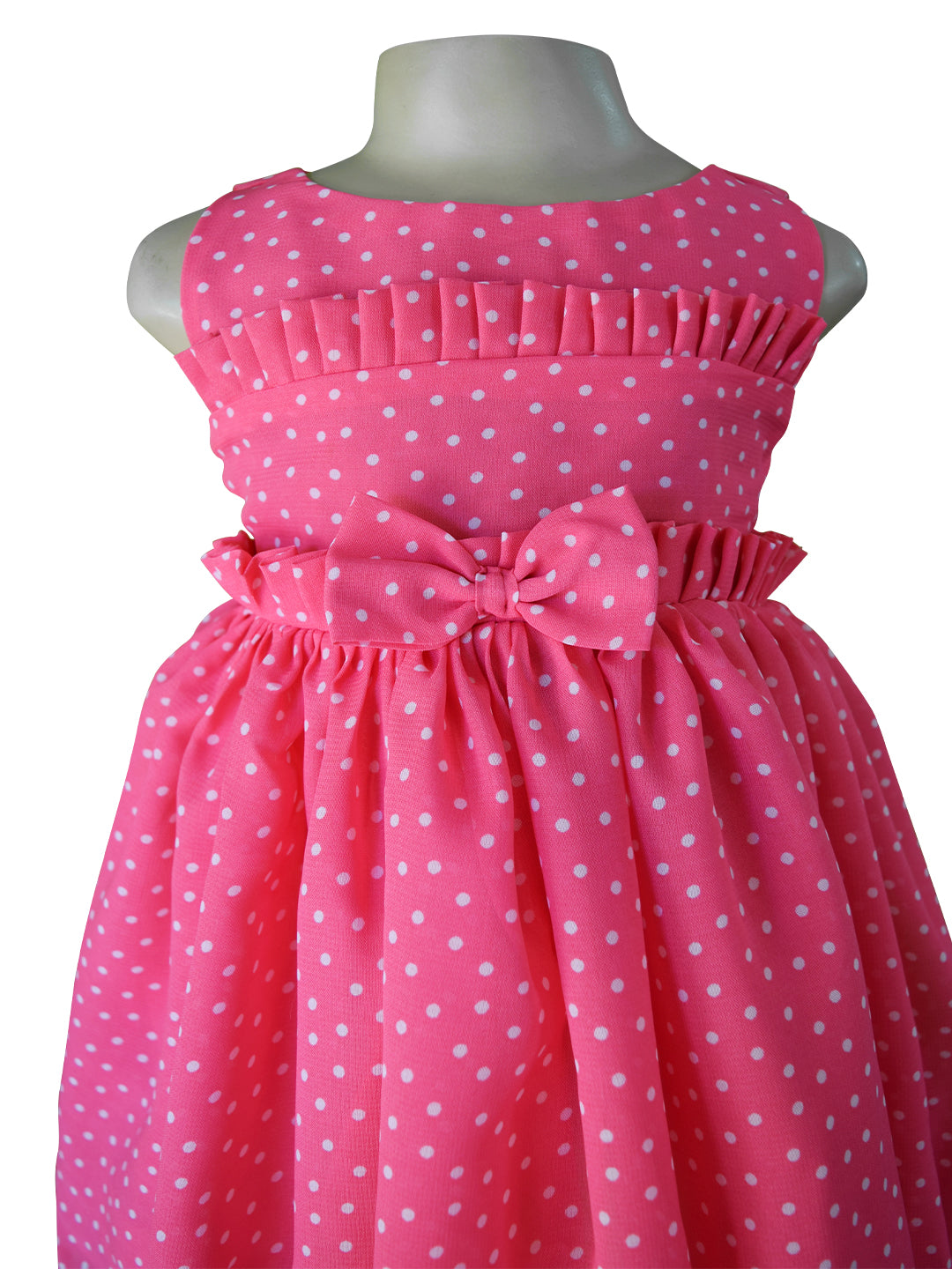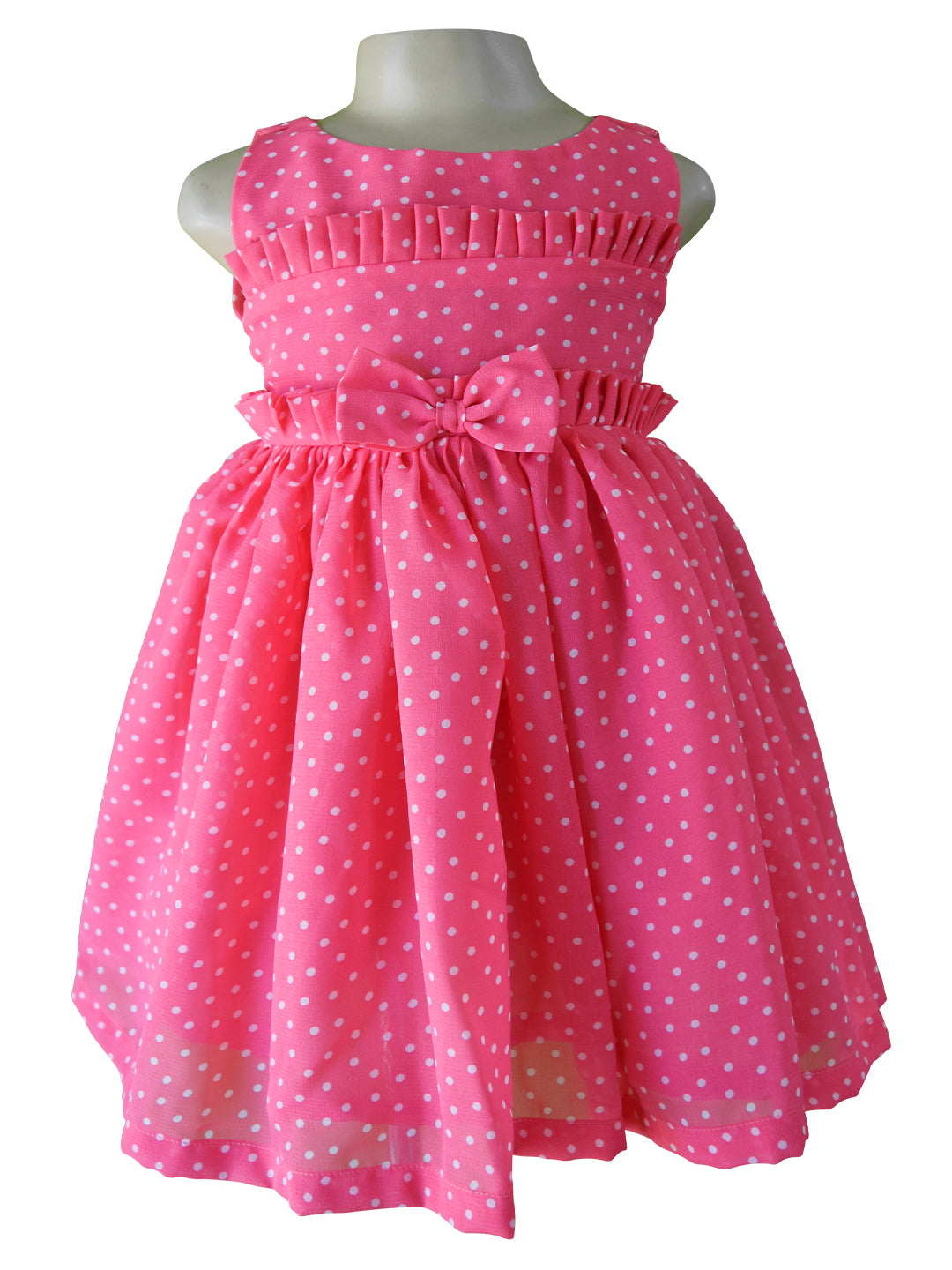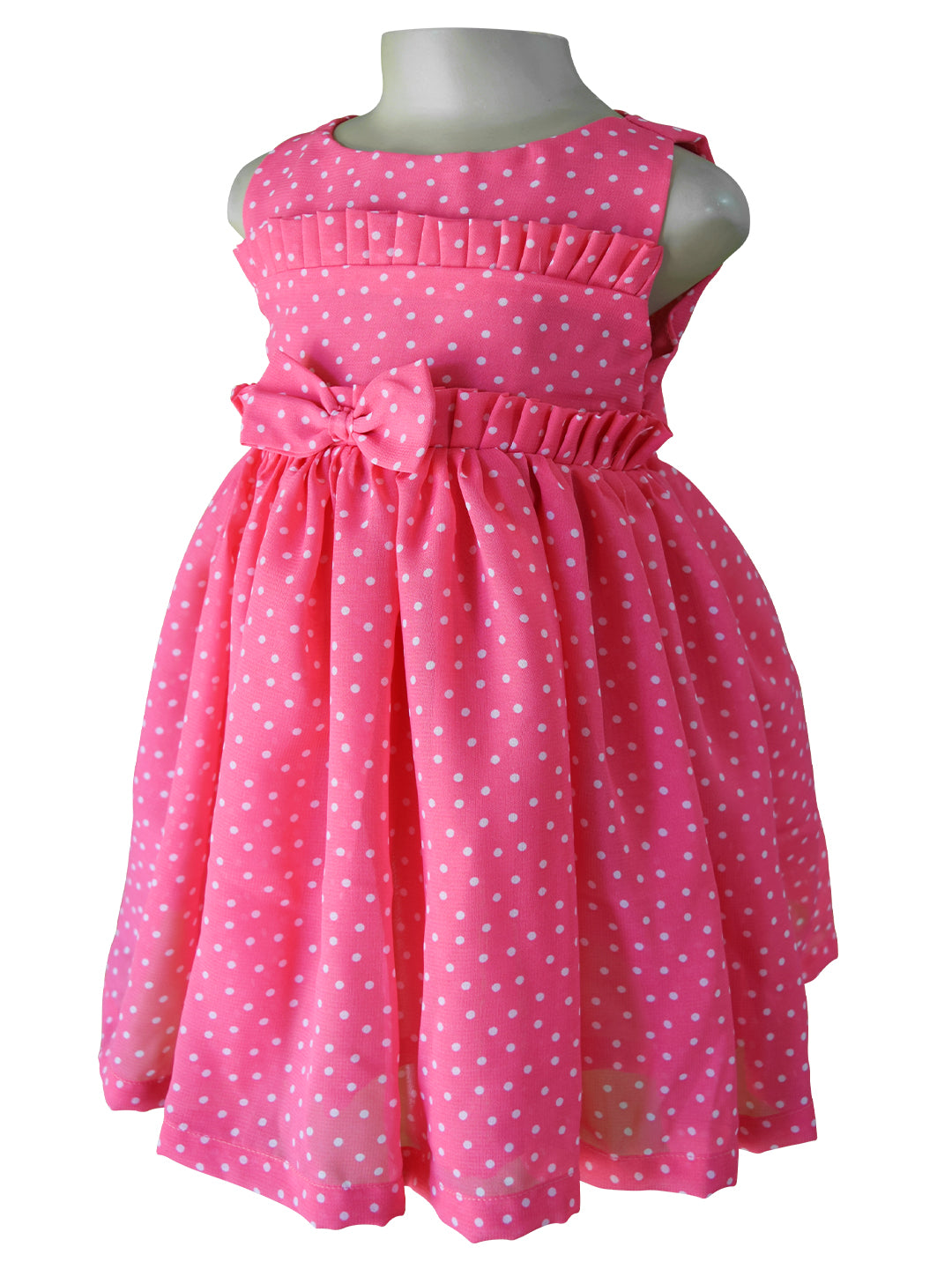 Pretty in Pink! This fun polka dot pink dress for girls has ruffles on the chest and waist. Made in georgette, it has a fully gathered skirt and is just right to make the everyday a less ordinary.