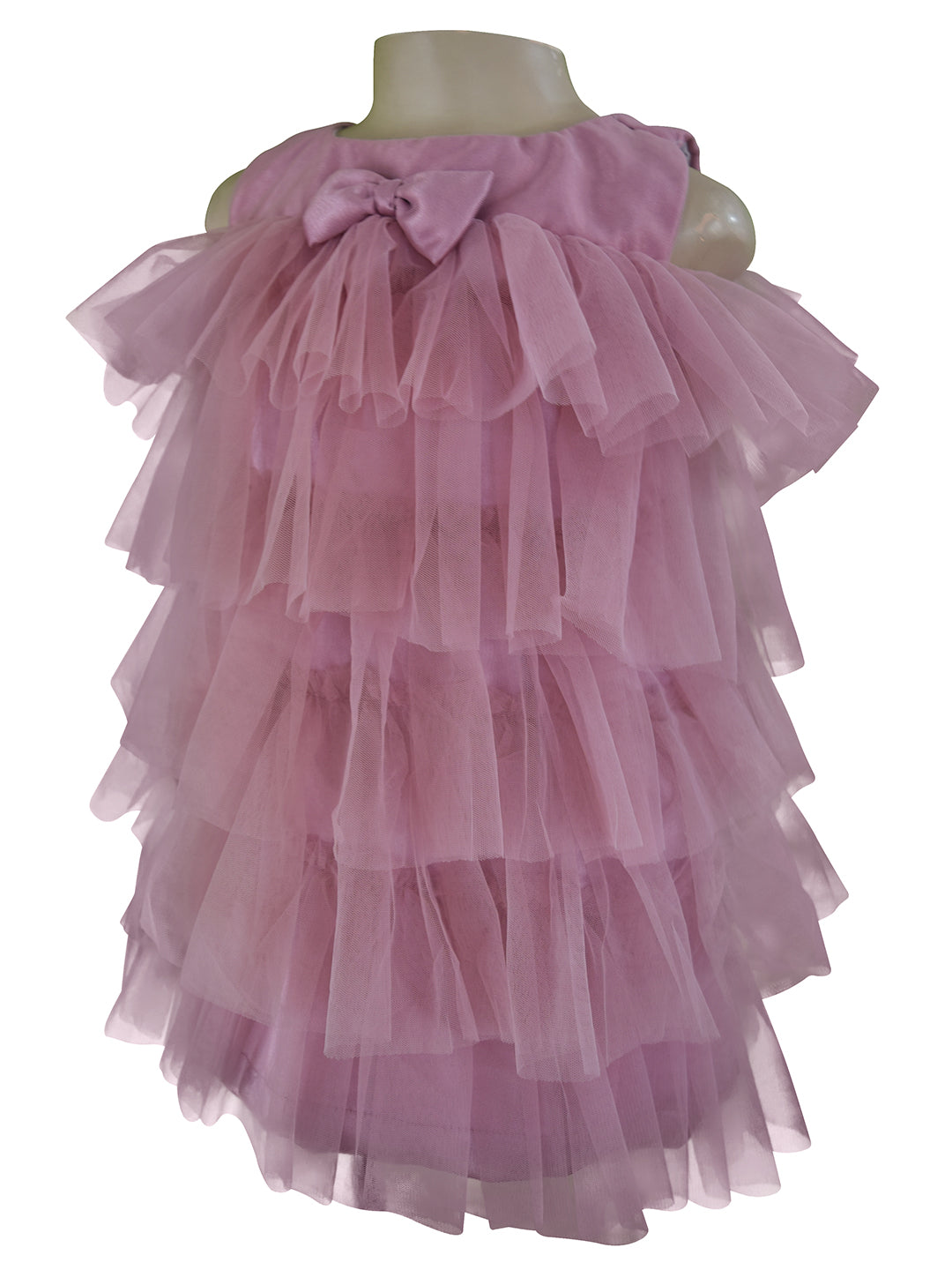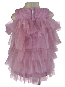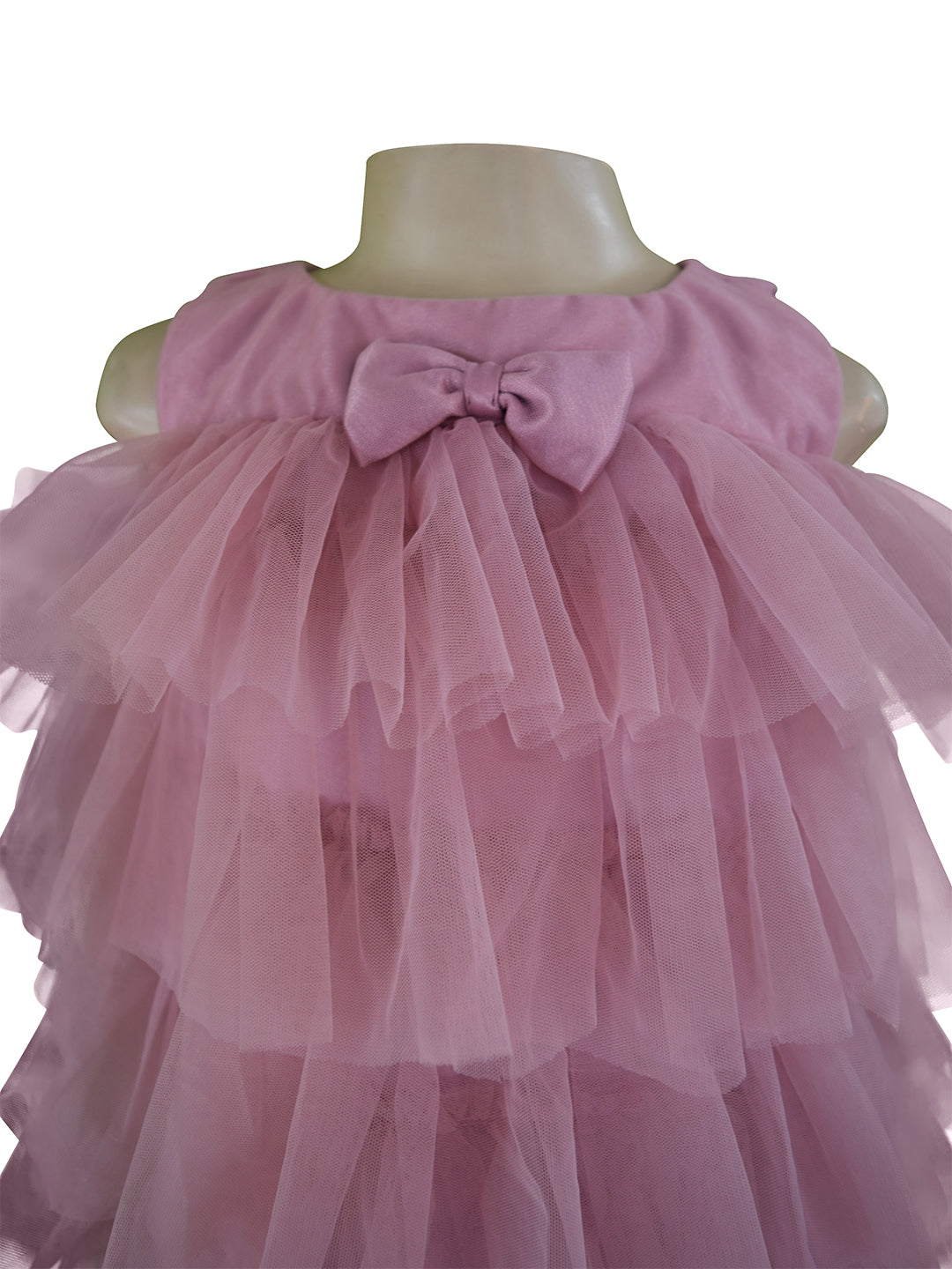 A striking dress for girls in Light Mauve. Made from net, this sleeveless dress boasts of layers of net ruffles and a bow trim on the shoulder.