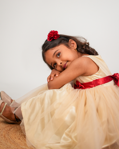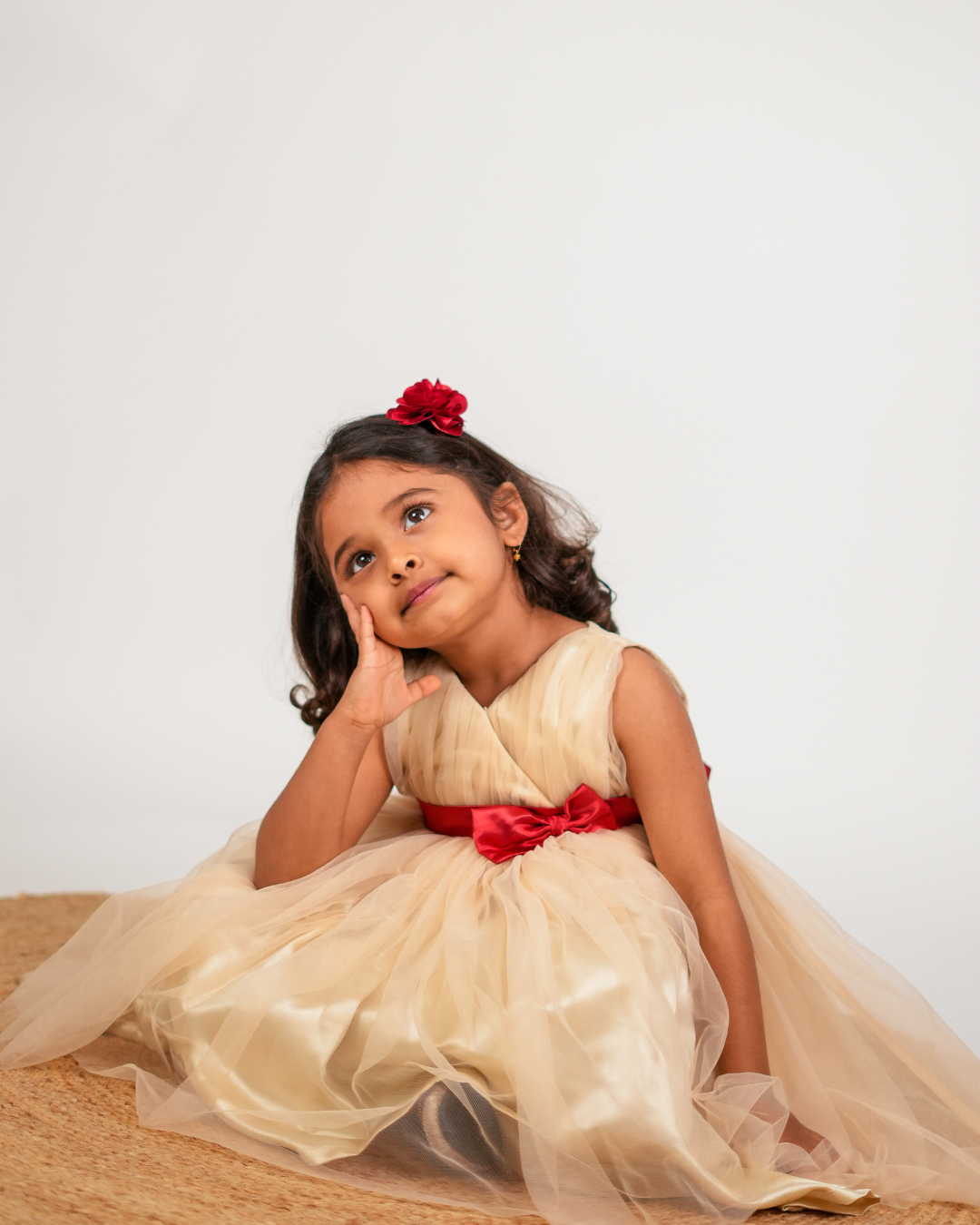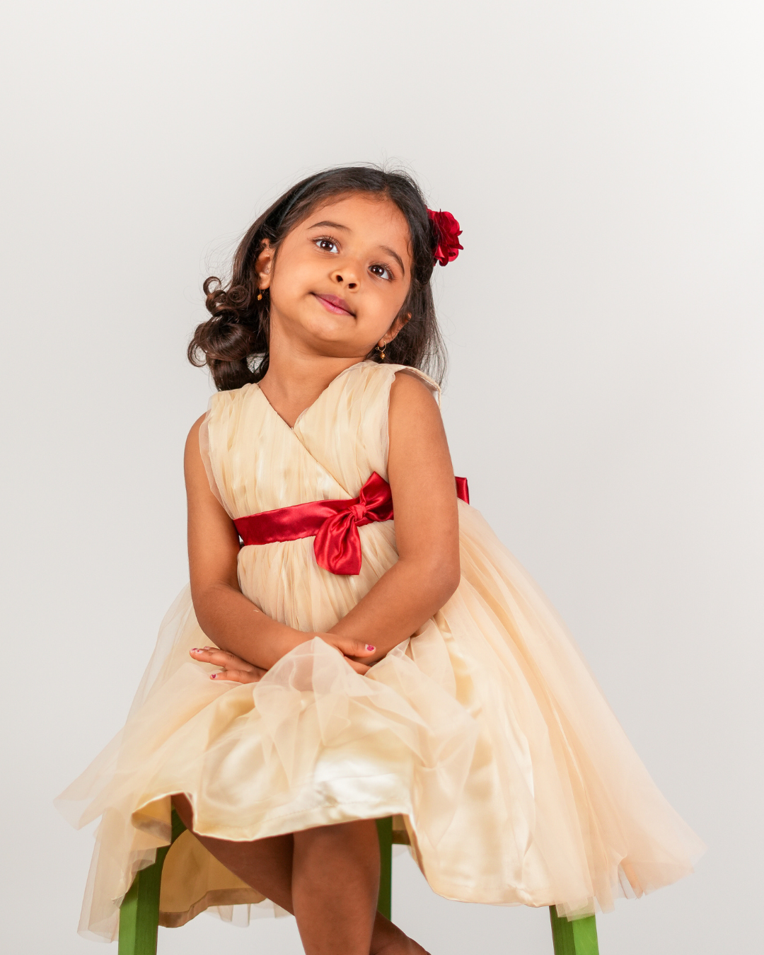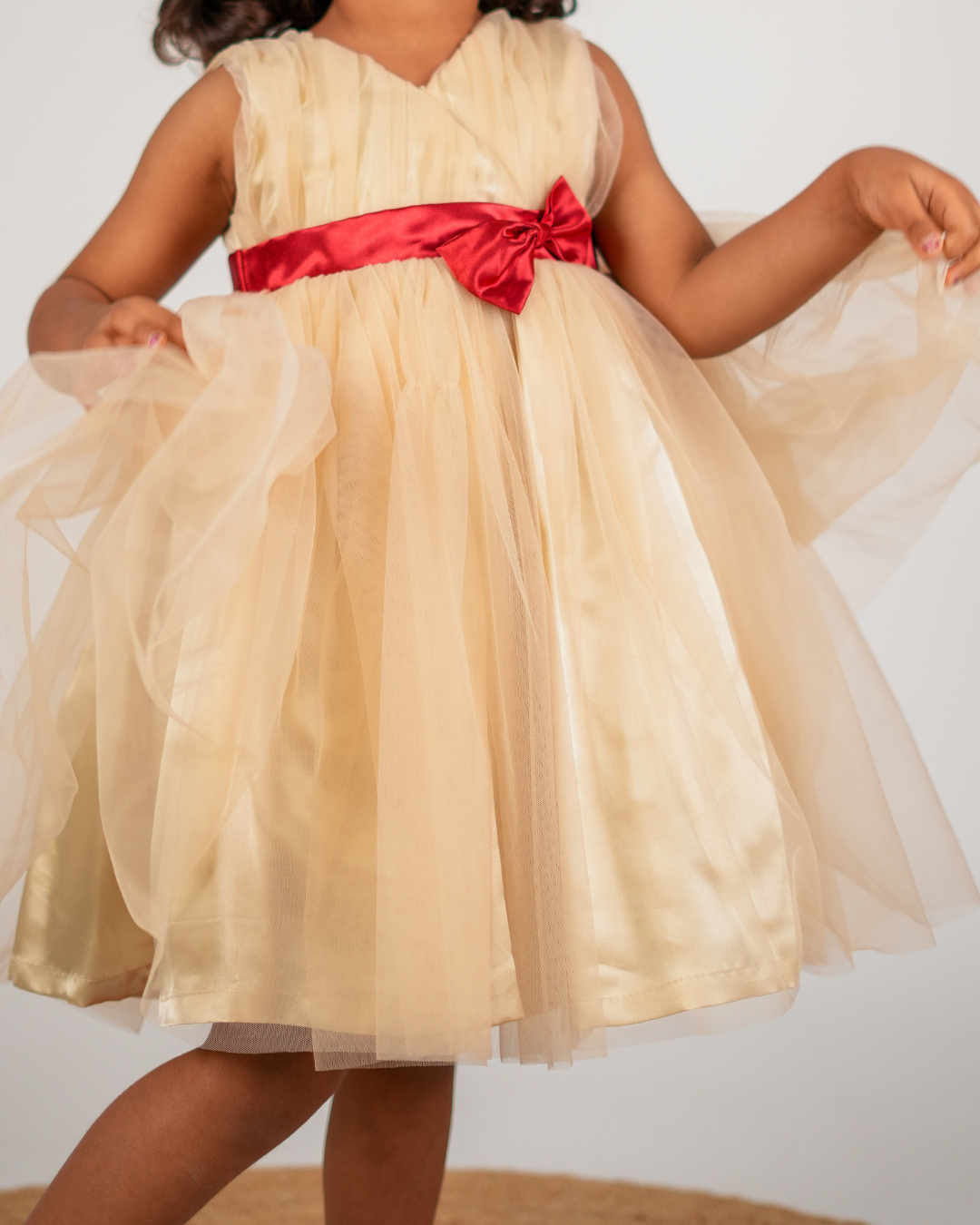 If you are in search of a champagne colour net dress, your search stops here. This beautiful dress features a crossover V-neck bodice with pretty ruching. The Maroon sash and a back tie belt defines the natural waistline. The skirt is voluminous and twirl worthy.