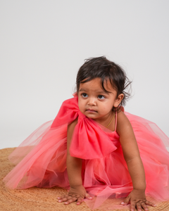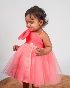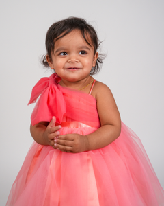 This fabulous special occasion dress for girls is absolutely gorgeous! The dress has a voluminous, gathered net skirt for a striking impact. Girly and chic, this one shoulder dress has a coral net ruched from side to side with an oversized bow placed beautifully on one shoulder
