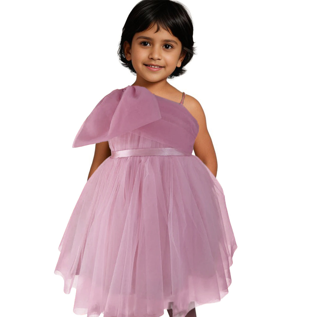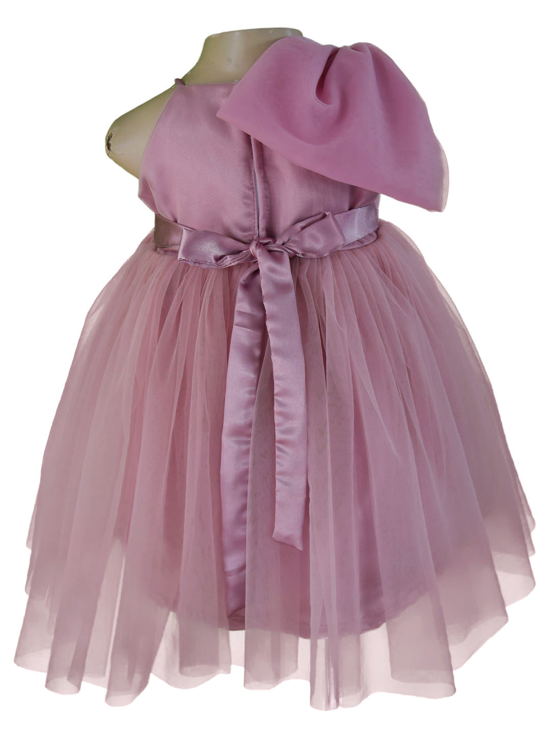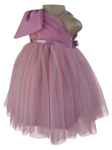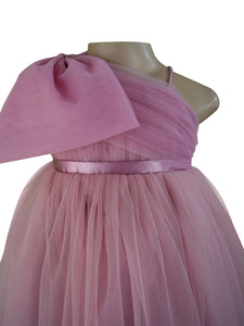 This fabulous special occasion dress for girls is absolutely gorgeous! The dress has a voluminous, gathered net skirt for a striking impact. Girly and chic, this one shoulder dress has a mauve net ruched from side to side with an oversized bow placed beautifully on one shoulder