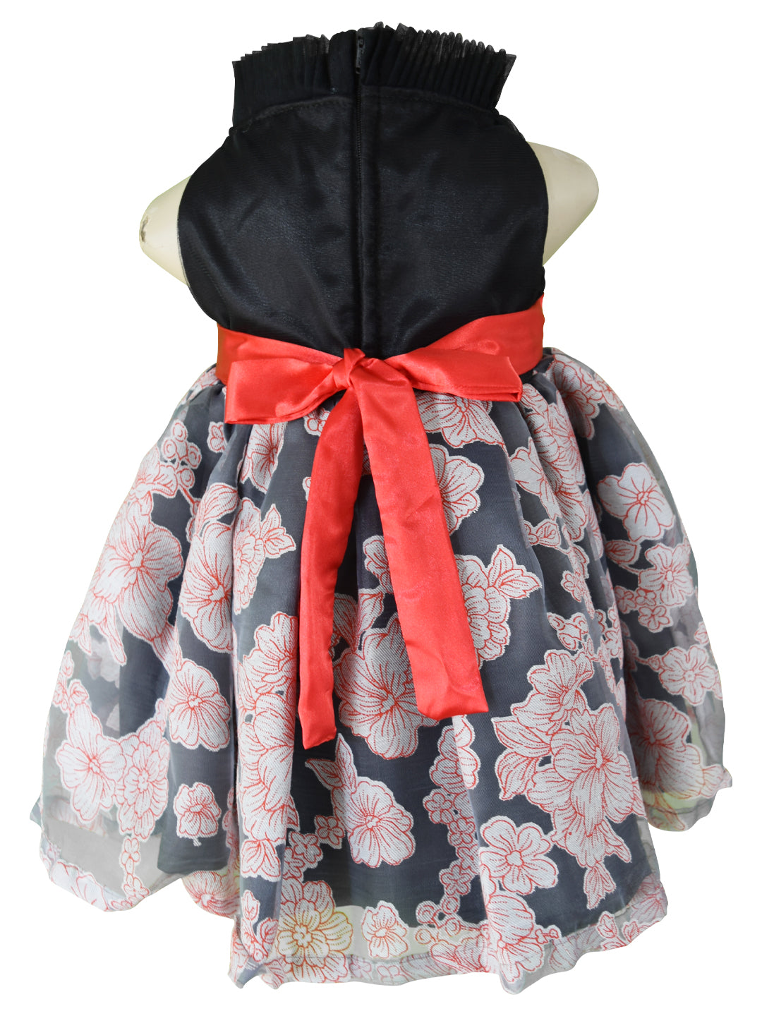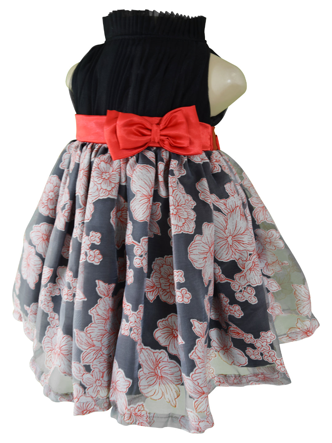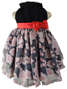 Adorned in beautiful White and Red floral prints on a black organza base, this pretty party dress for girls is sweet and elegant. This sleeveless dress has a gorgeous, pleated neckline with a gathered body and the full flowing skirt adds movement. The sash belt on the waist defines the A-line shape and can be tied back for a good fit.