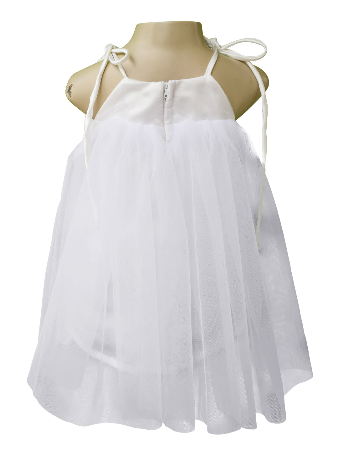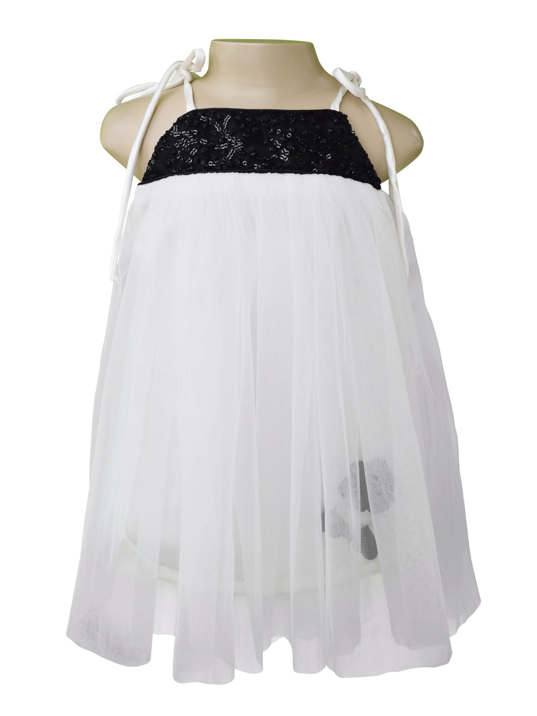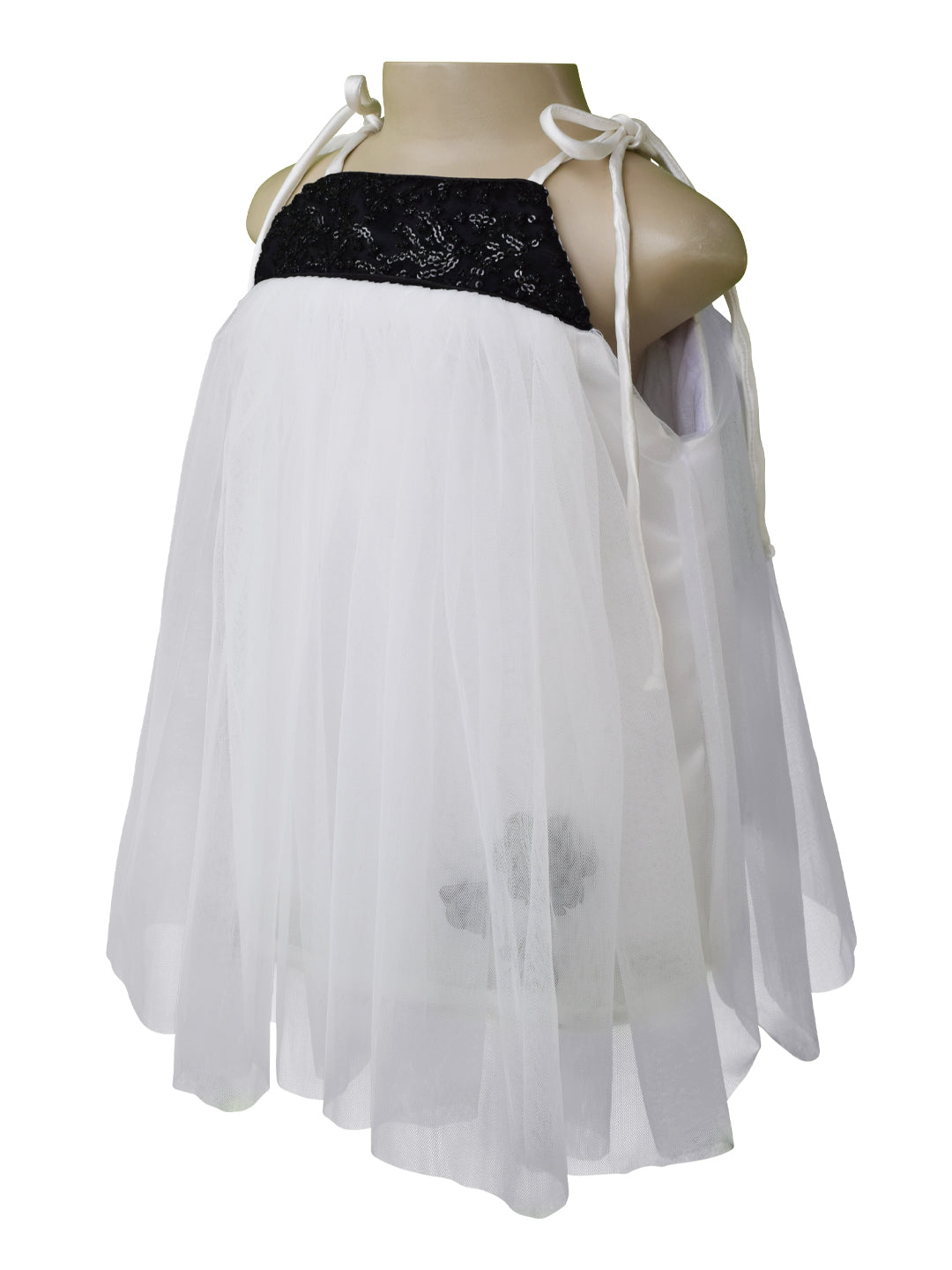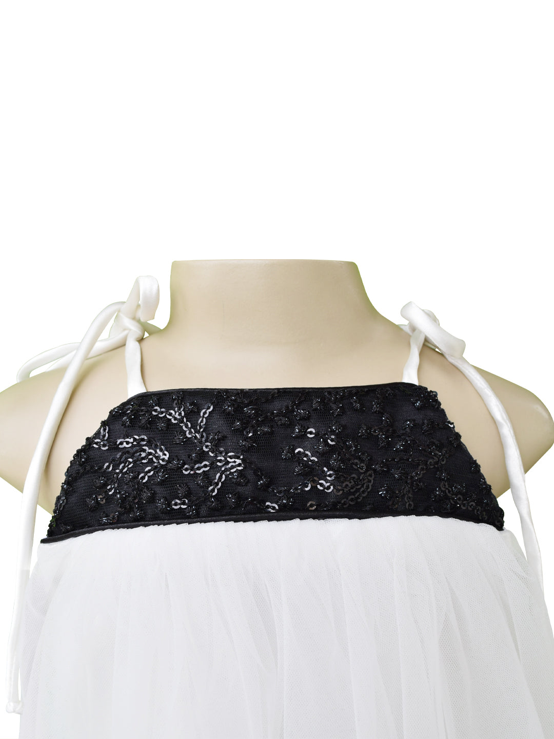 Shake things up in your little girls wardrobe by adding this unique, vintage-inspired dress. Made from a lightweight ivory-hued net fabric, this sleeveless one-piece boasts of a black banded square neckline with darling tie-shoulder detailing, and an oh so retro-chic breezy, easy fit. Black blooms adorn the hem. So effortlessly chic and flowy!