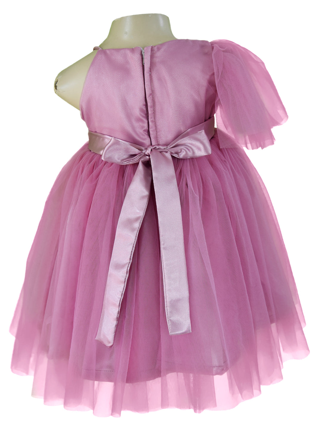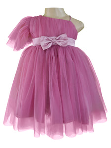 Elegance meets simplicity in this stunning dress. Made from a beautiful mauve colour net, this dress boasts of a single shoulder with a ruched bodice and gathered sleeves on one side. The skirt is artfully gathered at the waistline falling in a voluminous cascade. Perfect for all celebrations!
