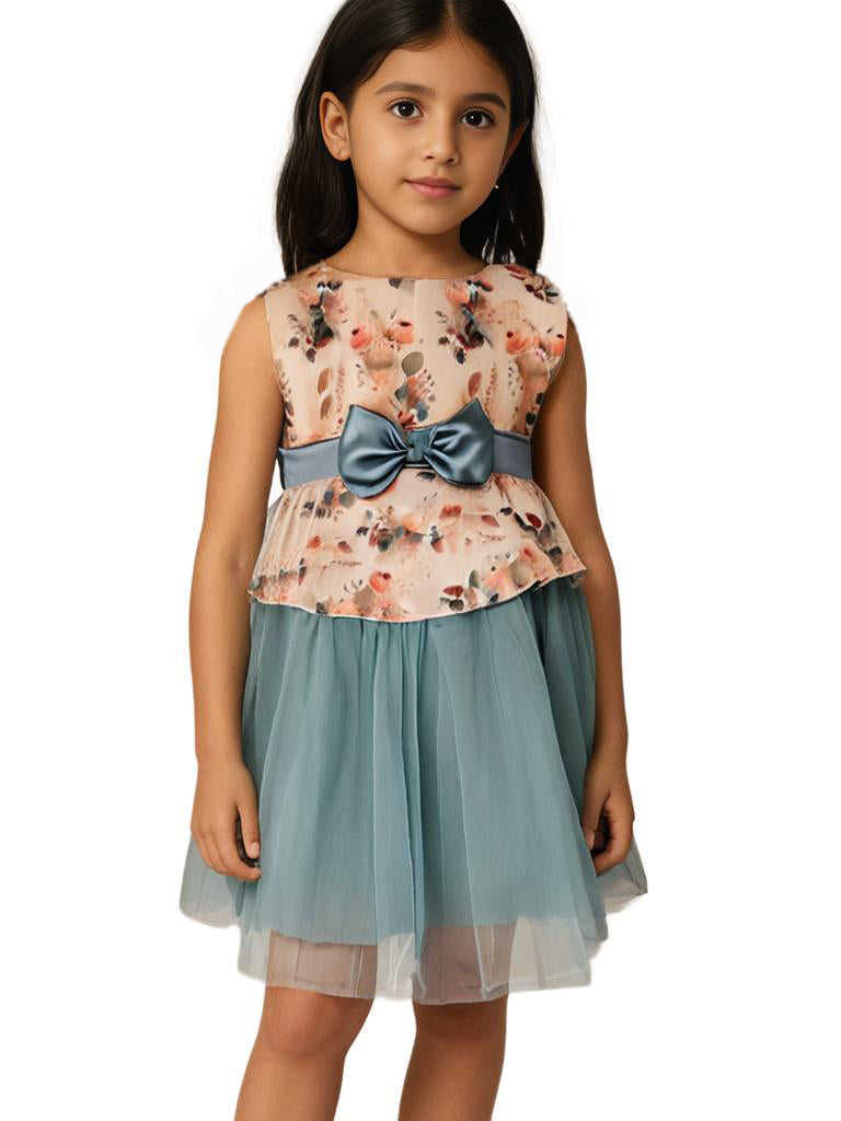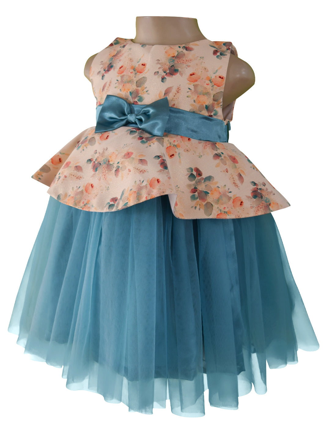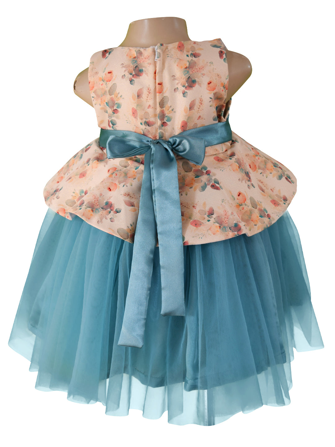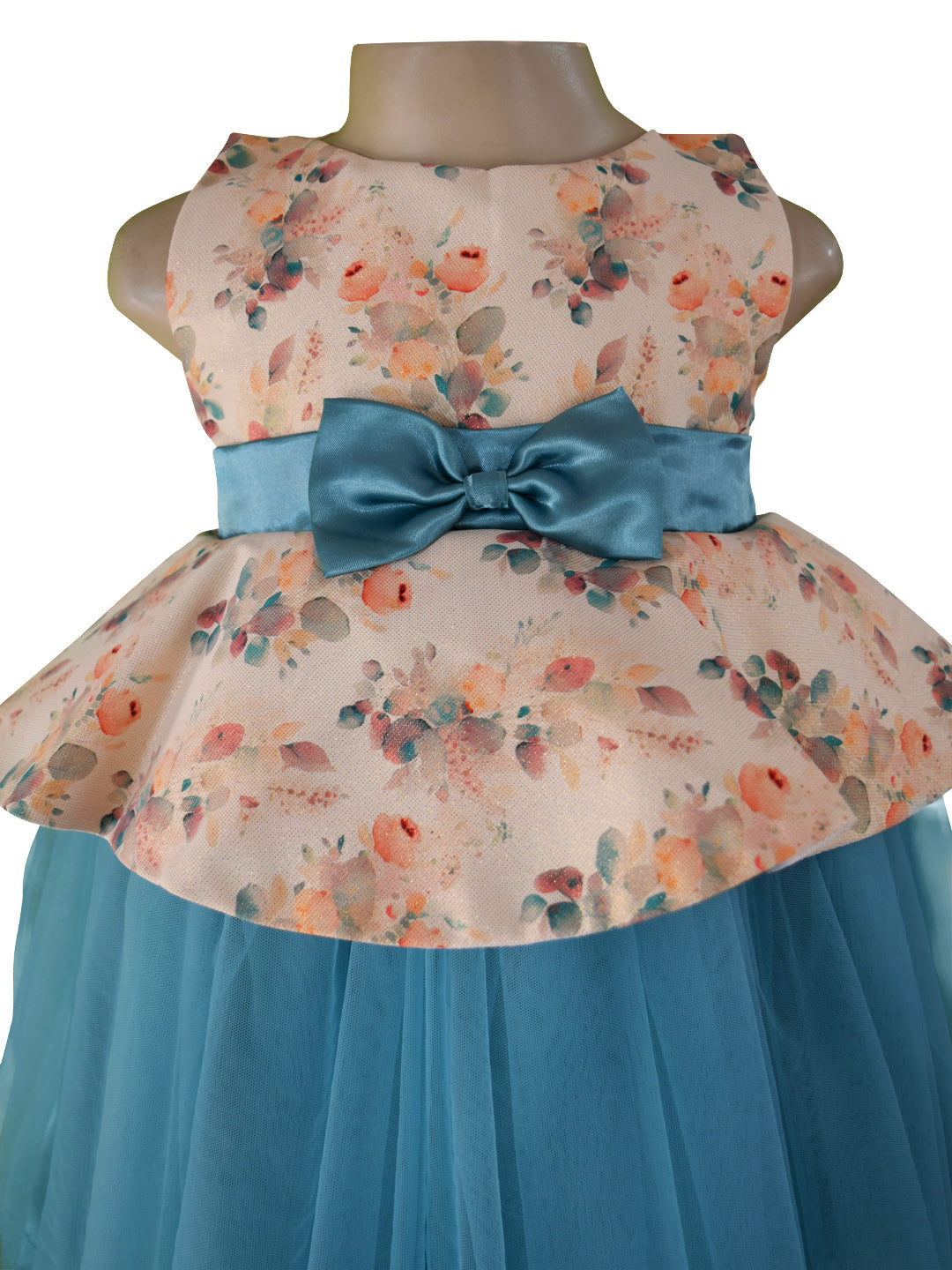 A stunning light gold and teal dress for little girls! Offering an eye catching look for special occasions, the body is covered in pretty floral prints on a light gold base. The dress is banded with a self tie bow with a peplum style skirt. The skirt is voluminous and twirl ready.