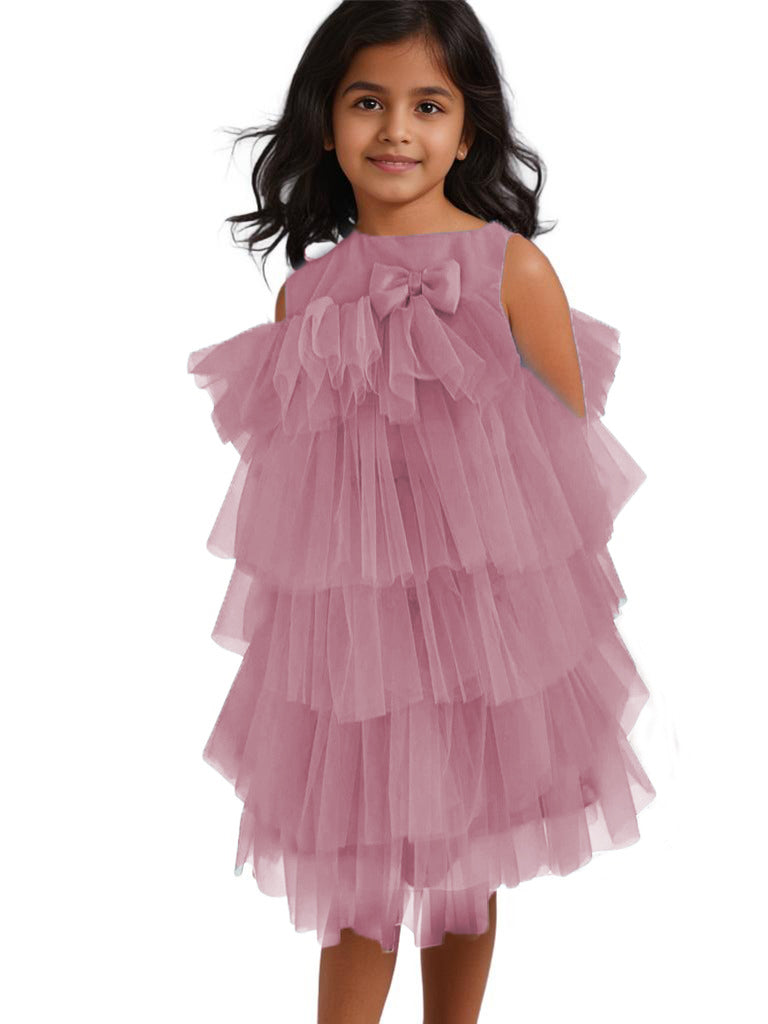 A striking dress for girls in Blush Pink. Made from net, this sleeveless dress boasts of layers of net ruffles and a bow trim on the shoulder.