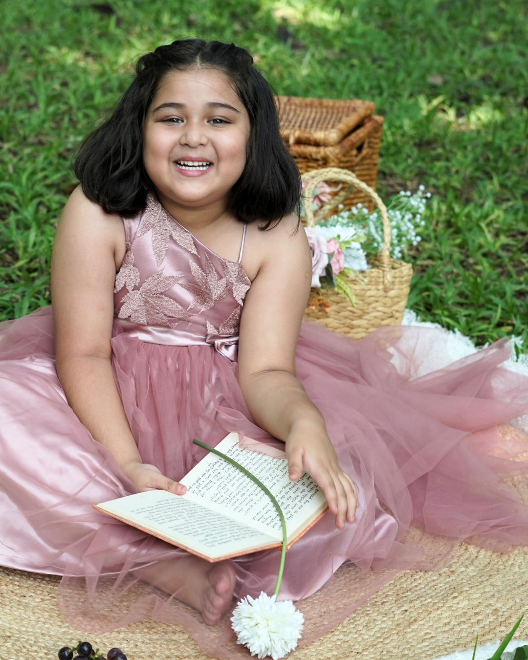 In a gorgeous shade of blush pink, this chic dress features asymmetrical sleeves and a delicately embroidered bodice that is banded at the waist with an oversized bow. The voluminous net hi-low skirt completes the look for the perfect birthday dress!