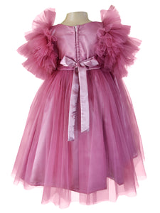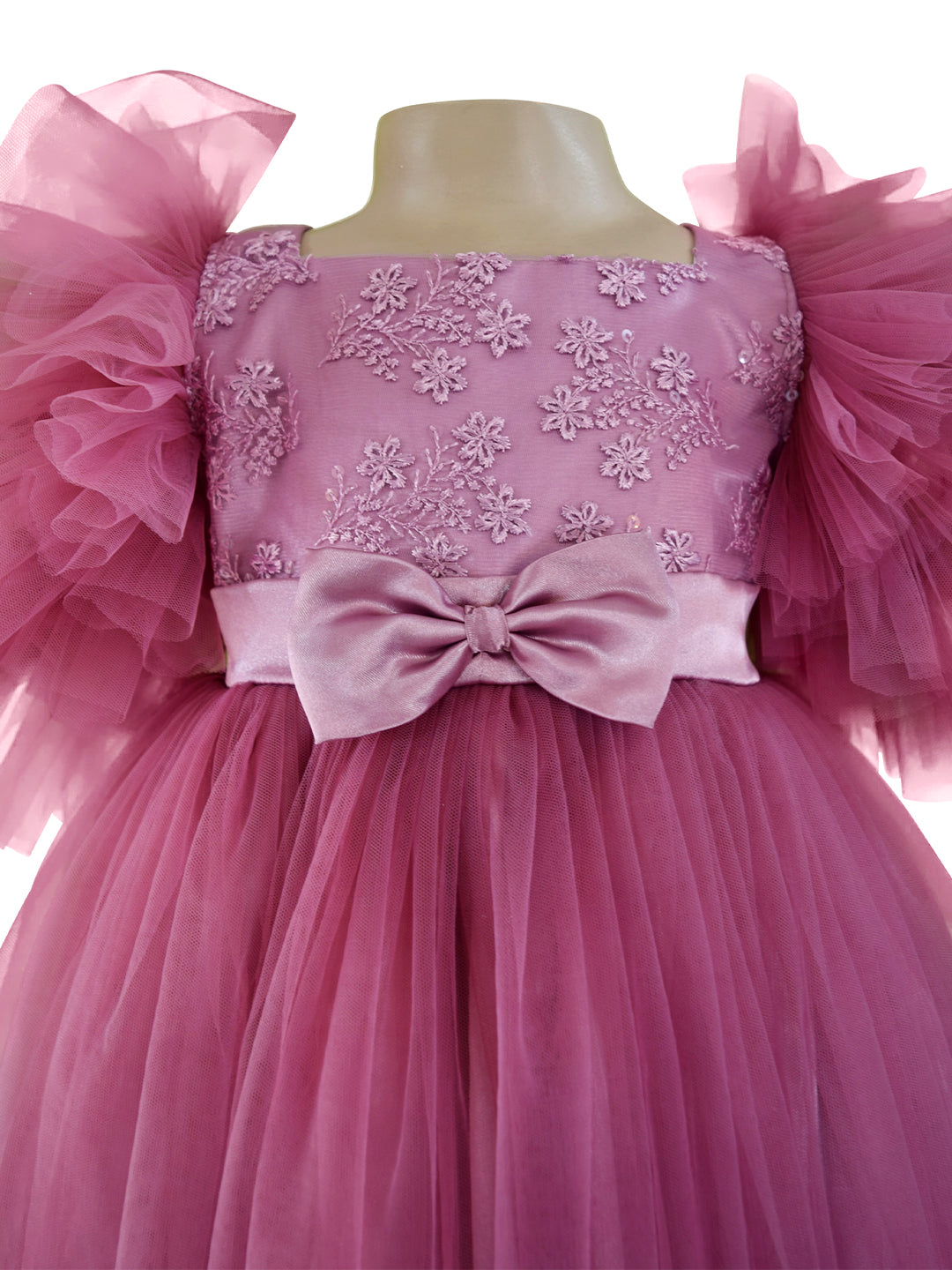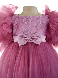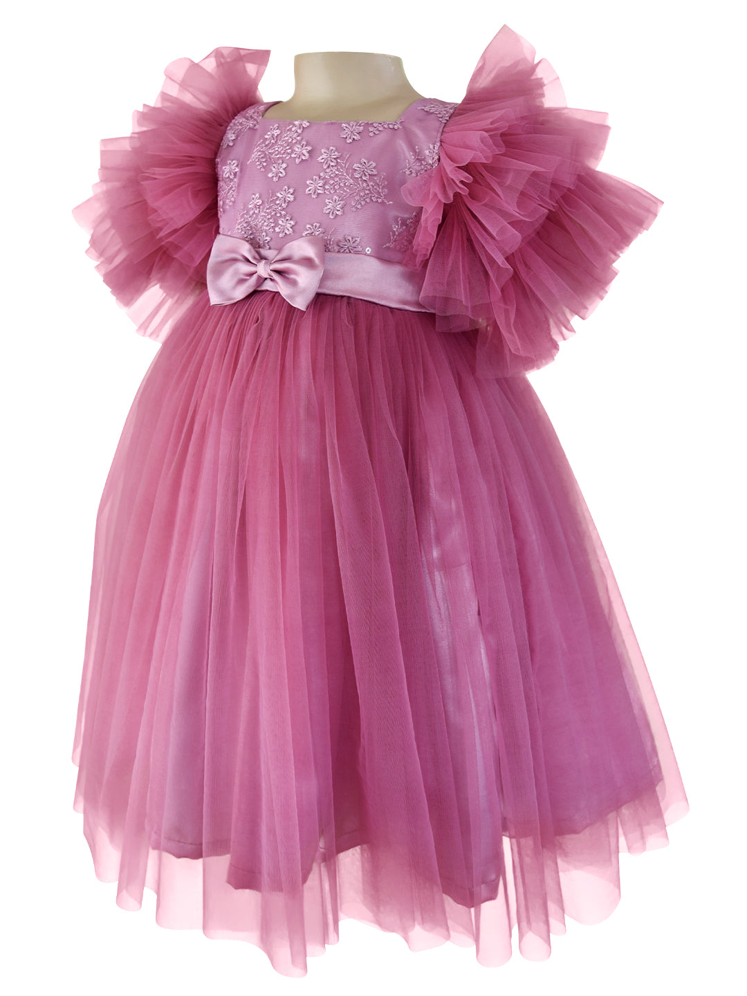 Gorgeous gown in a mauve colour for baby girls. Embellished with tiers of sheer ruffles on the sleeves, this gown boasts of an embroidered body & banded waist. The skirt is voluminous, comfortable & airy. Ideal for parties & special occasions.
