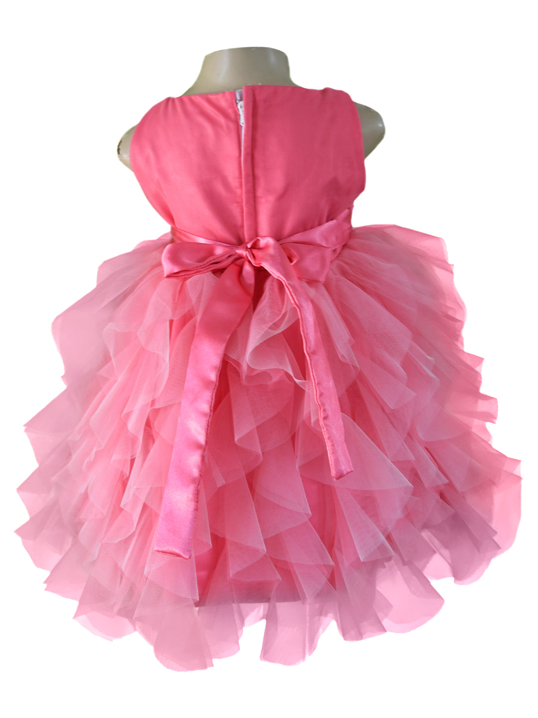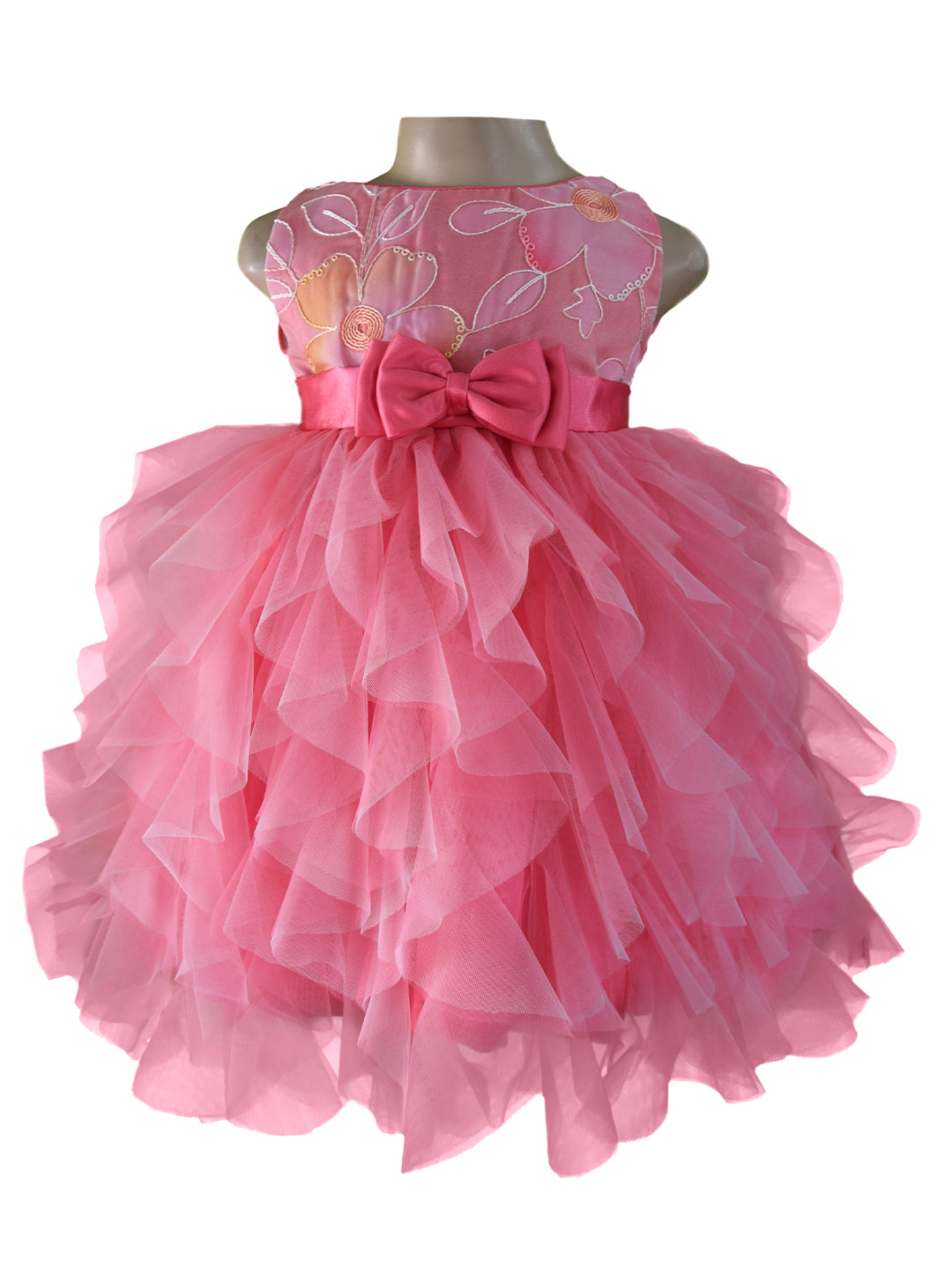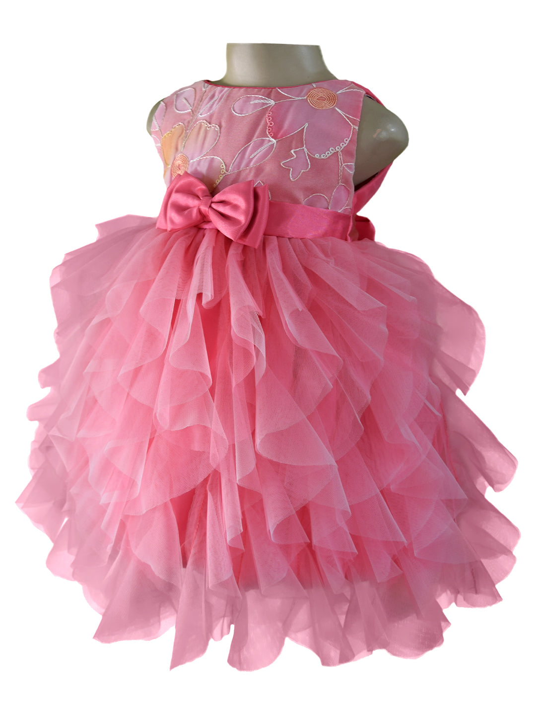 Your little princess will beam with joy in this two tone waterfall dress. This gorgeous little girl’s dress features an embroidered tissue bodice. The waist is cinched with a satin band and full-bodied ruffles in Onion Pink & Pink net adorn the skirt.