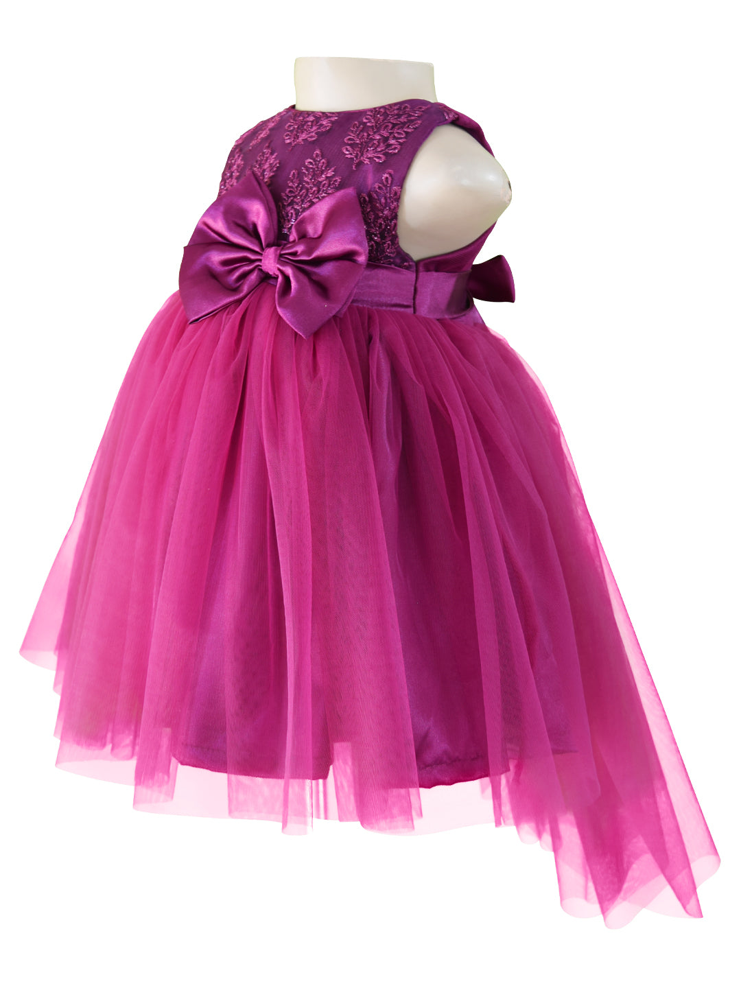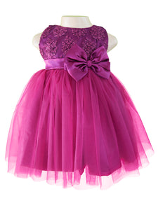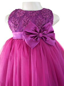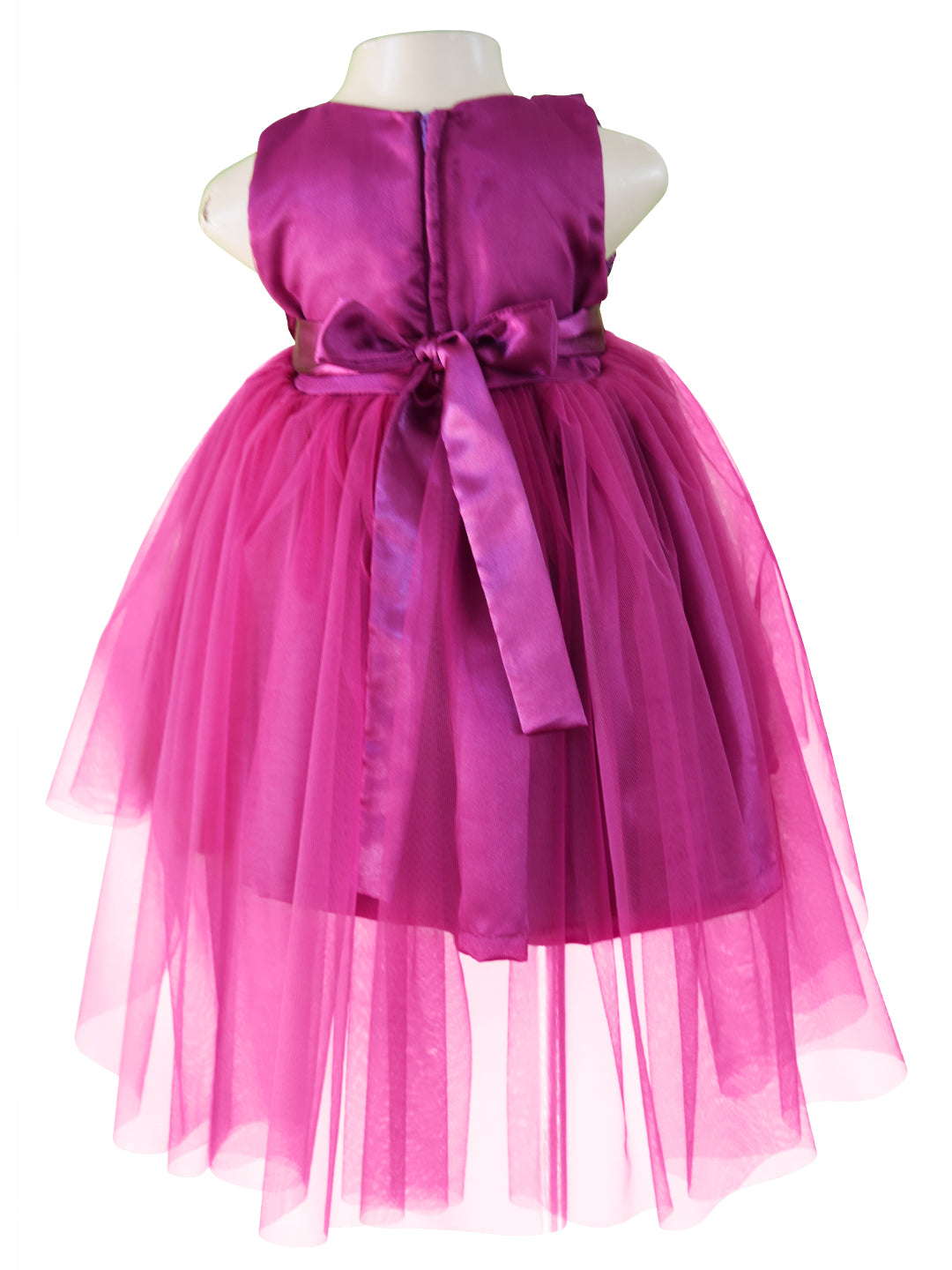 Filled with sweet style, this gorgeous girls party dress comes with a sleeveless plum bodice and boasts of embroidered net that cover it entirely and a zipper that secures the fit in the back. The gorgeous plum net skirt falls in a hi-low style and looks chic! This dress is perfect for Birthday Parties and special occasions!
