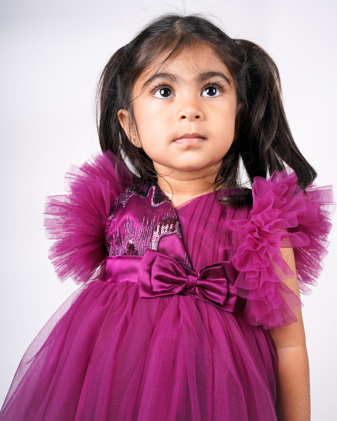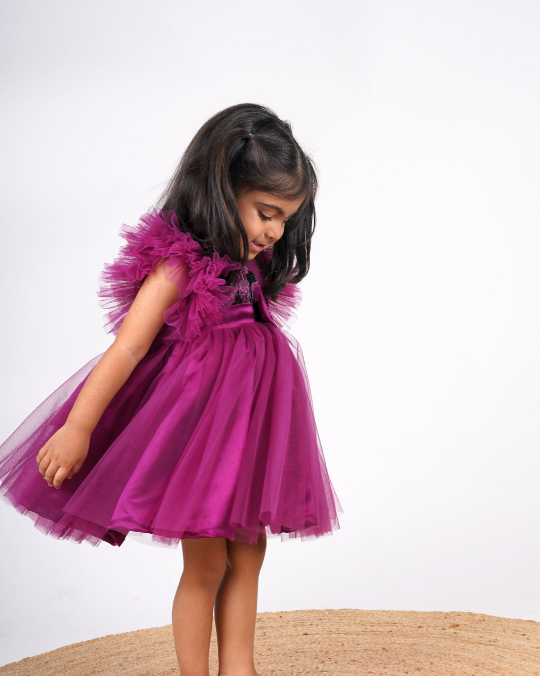 Adorned in striking embroidery on one side and ruched net on the other, this wine coloured dress is not easily forgotten. Featuring a surplice neckline, and full ruffle sleeves, this dress is banded at the waist with a double bow and a gathered net skirt that flows down to the knees. A true must-have.