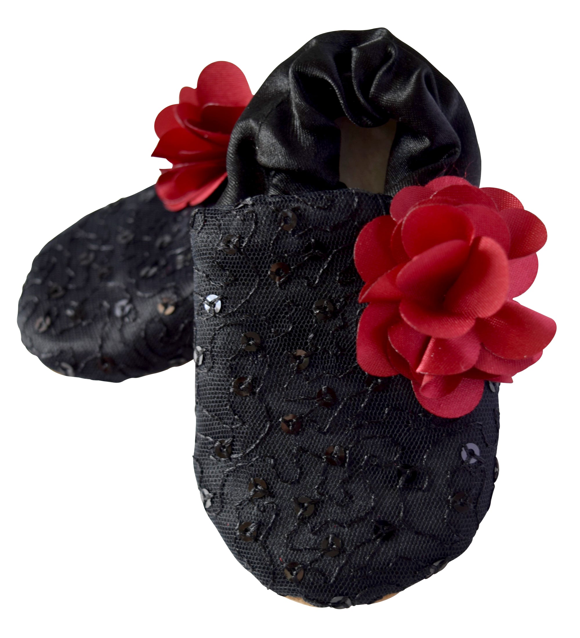 Black Mono Lace on Black Satin with Maroon Flower Booties