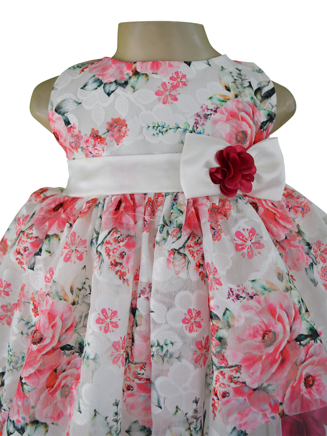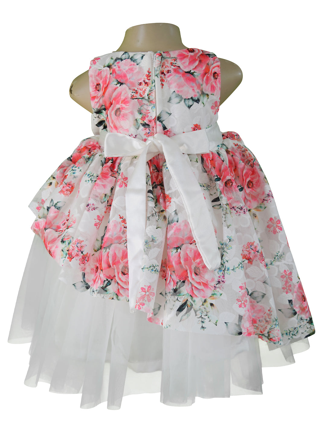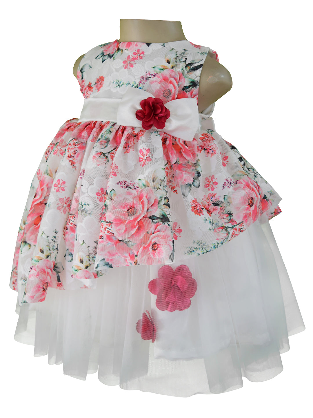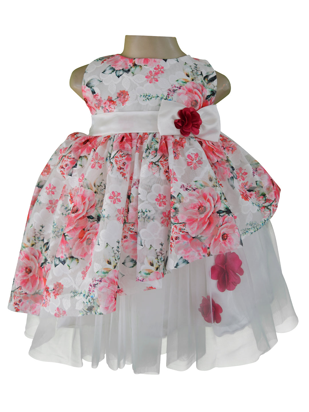 Our deep pink floral party dress for girls is a breath of fresh air in your little girls wardrobe, thanks to its pretty floral print. For a stylish twist, this dress features an asymmetric hem in lace with layers that make it full & voluminous. The skirt has floral blooms on the skirt and also on the waist. This floral dress for girls is made to stand out at parties and events.