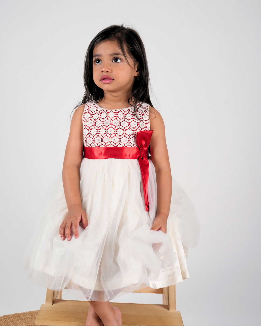 This deceptively simple dress features a bodice made of cream lace over red satin and is banded at the waist with vertically placed bow on the side. The net skirt is gathered and voluminous. A zipper secures the back, along with a self-tie sash for the perfect fit.
