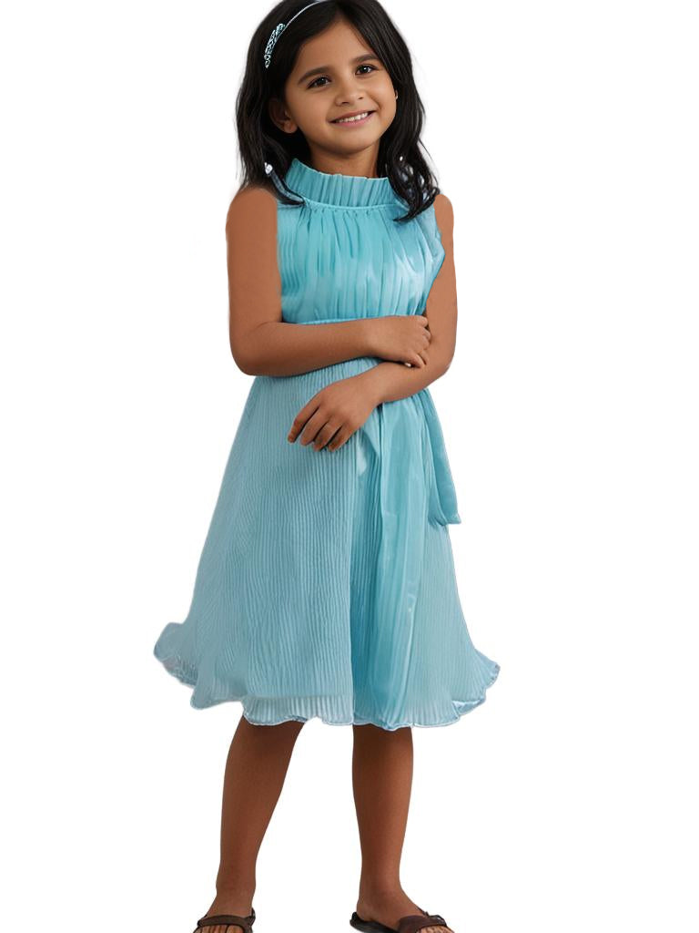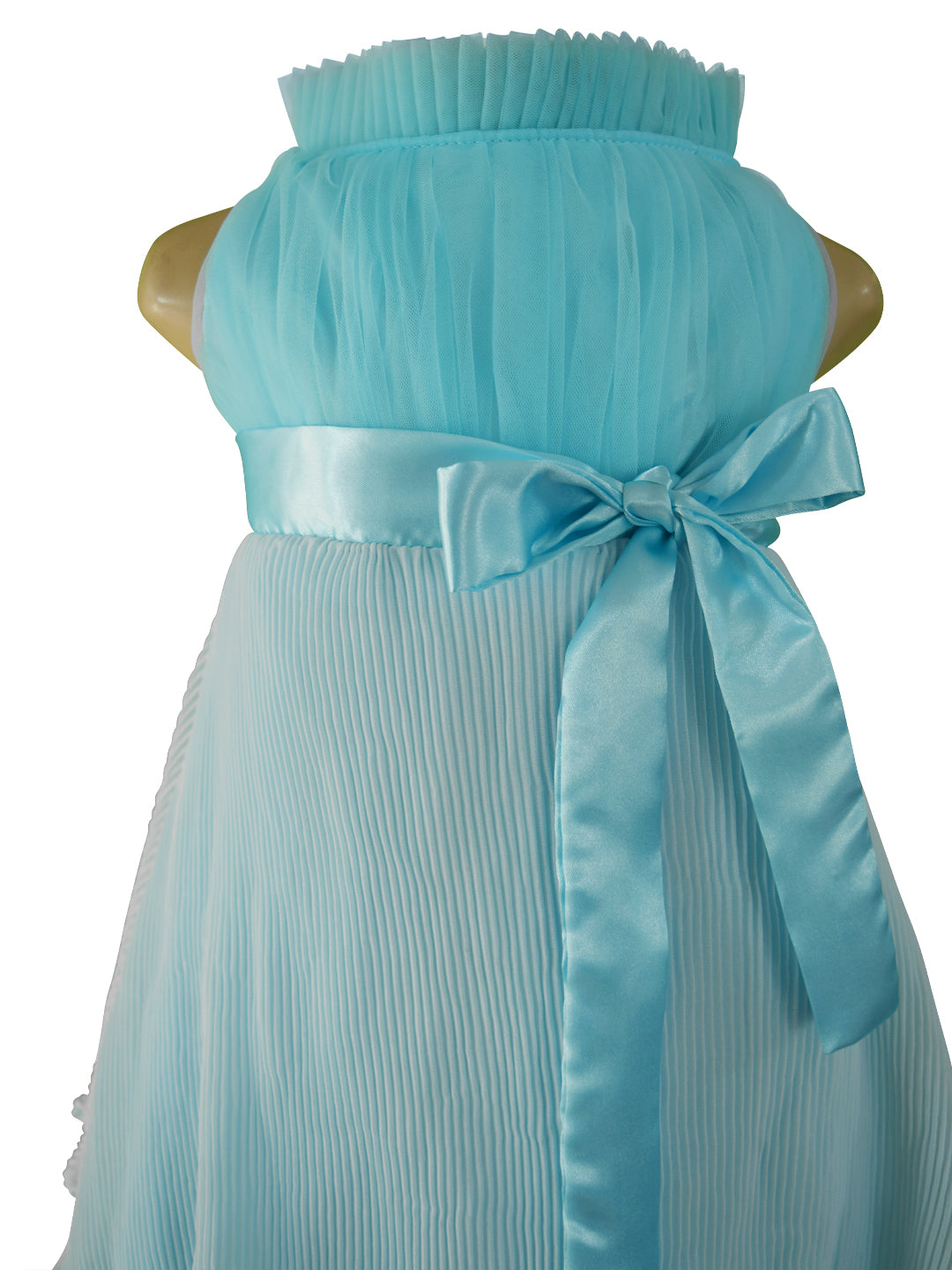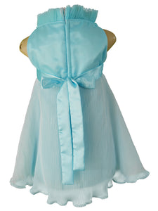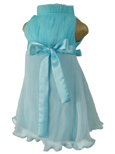 Panel after panel of perfectly sweet pleats in a sky-blue chiffon fabric gives this vintage inspired dress a silhouette that is hard to forget! The sleeveless body is ruched in a sky-blue net with pleating on the neck. The waist is banded and can be tied into a bow. A charming pale/sky blue occasion dress for your little girl.