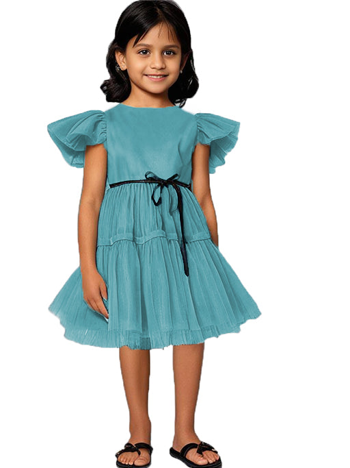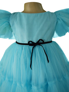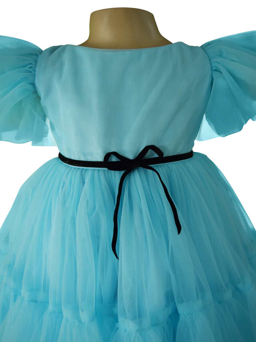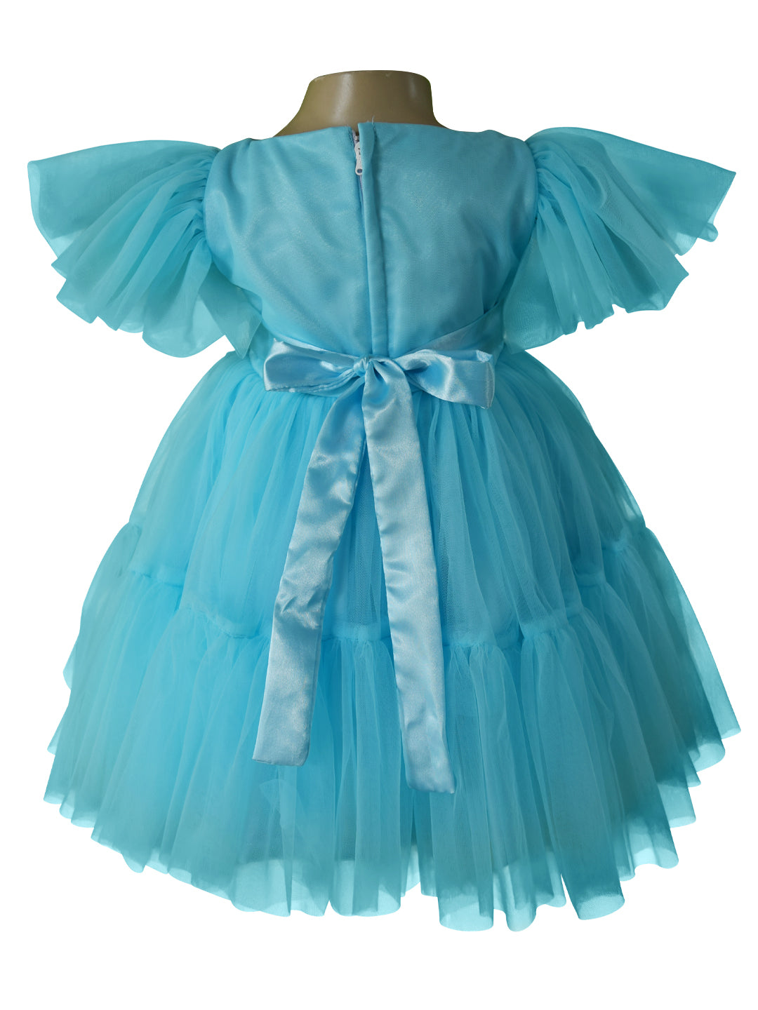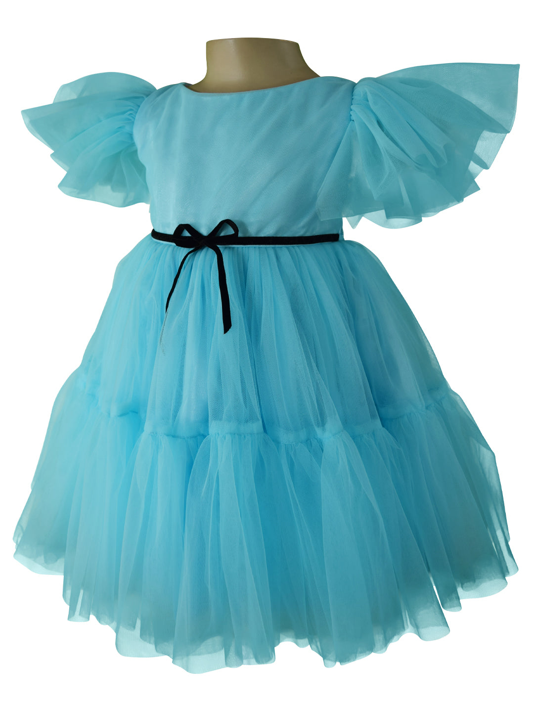 Delight your princess with this gorgeous frozen blue dress. This elegant-yet-playful little girl dress boasts a round neckline, short and gathered sleeves, waist-cinching tie-bow detailing at the back, and a gathered voluminous skirt with a deep ruffle hemline all in a frozen blue colour net.