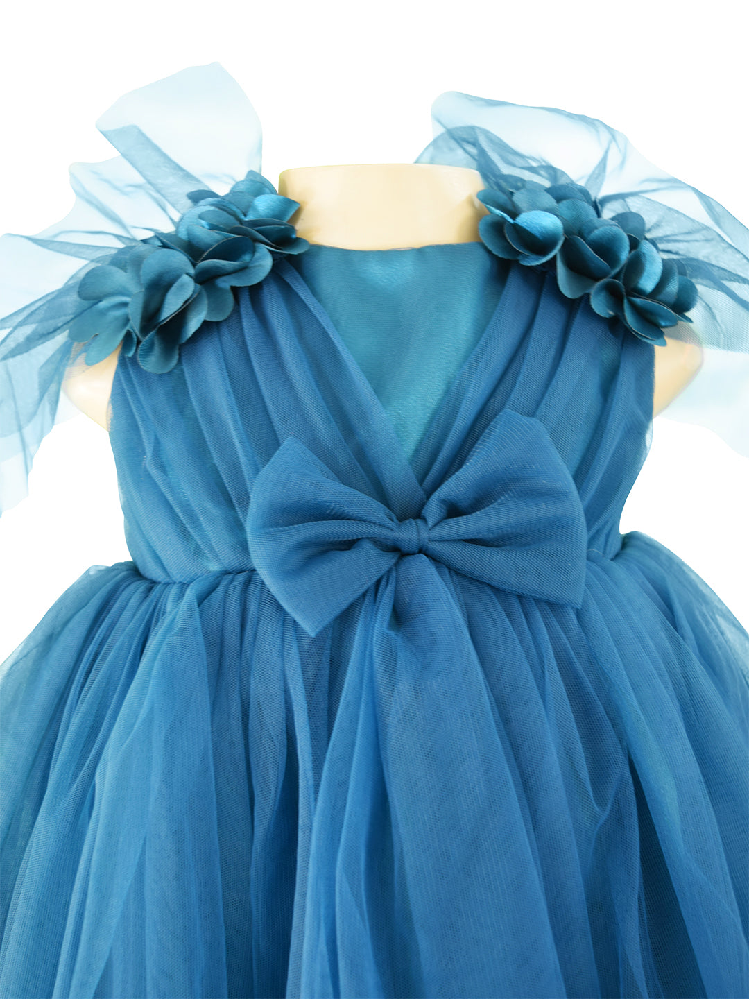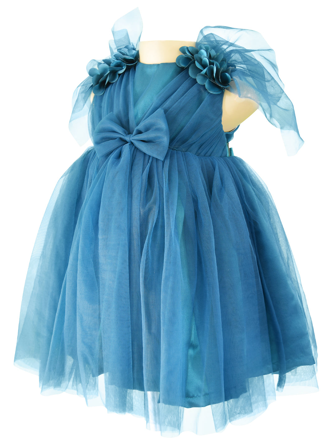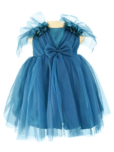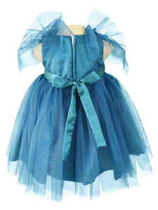 Your little girl’s precious moments and most special occasions were on top of our minds while designing this stunning Teal Green coloured dress. An elegant bodice with artfully ruched and placed v-neck in a net fabric that meets the shoulders. Blooms are placed and the net falls out in layers for a classic look. The skirt is gathered and voluminous.